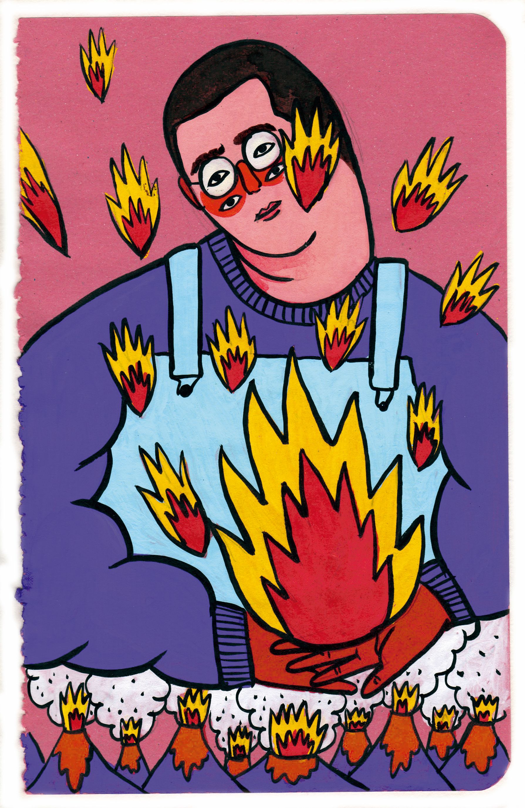 El estilo naïf es presente en sus cuadros, cuyos colores fuertes y vibrantes reflejan sus variadísimas referencias estéticas –los videojuegos, los cómics y dibujos animados, los superhéroes, el tarot, el arte popular, los universos místicos en general. Muchos de los personajes tienen cuatro (o seis) ojos en vez de dos, y la explicación es sencilla: son capaces de ver más allá, dueños de una sabiduría que trasciende la educación formal.