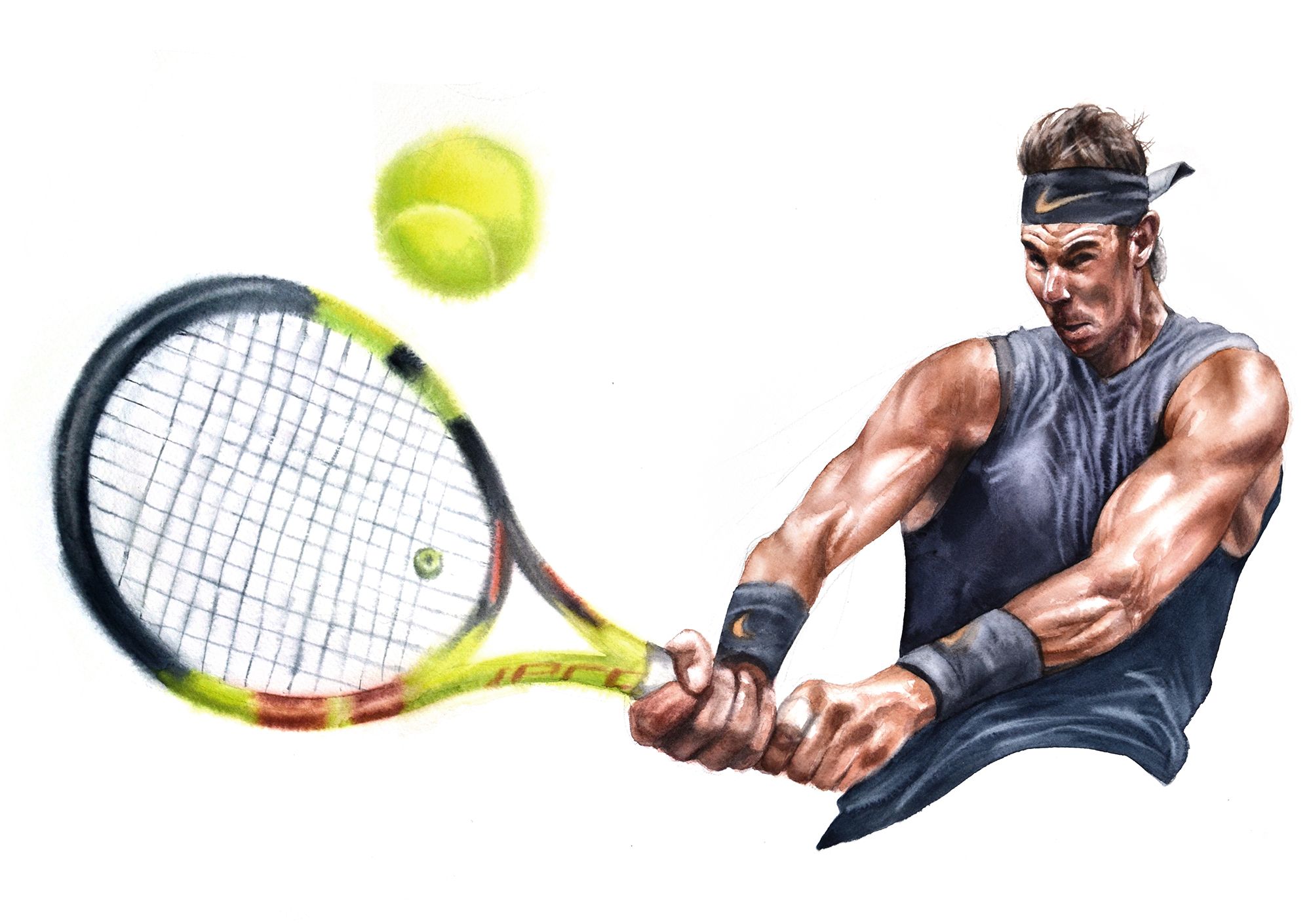 Este trabajo fue una noche sin dormir. Yo tenía muy clara cuál era la pose que quería y sabía que la raqueta tenía que estar en primer plano. Si bien tenía una foto con esa pose, no quería plagiar al fotógrafo, por lo que decidí combinar varias imágenes para lograr esa expresión de esfuerzo.