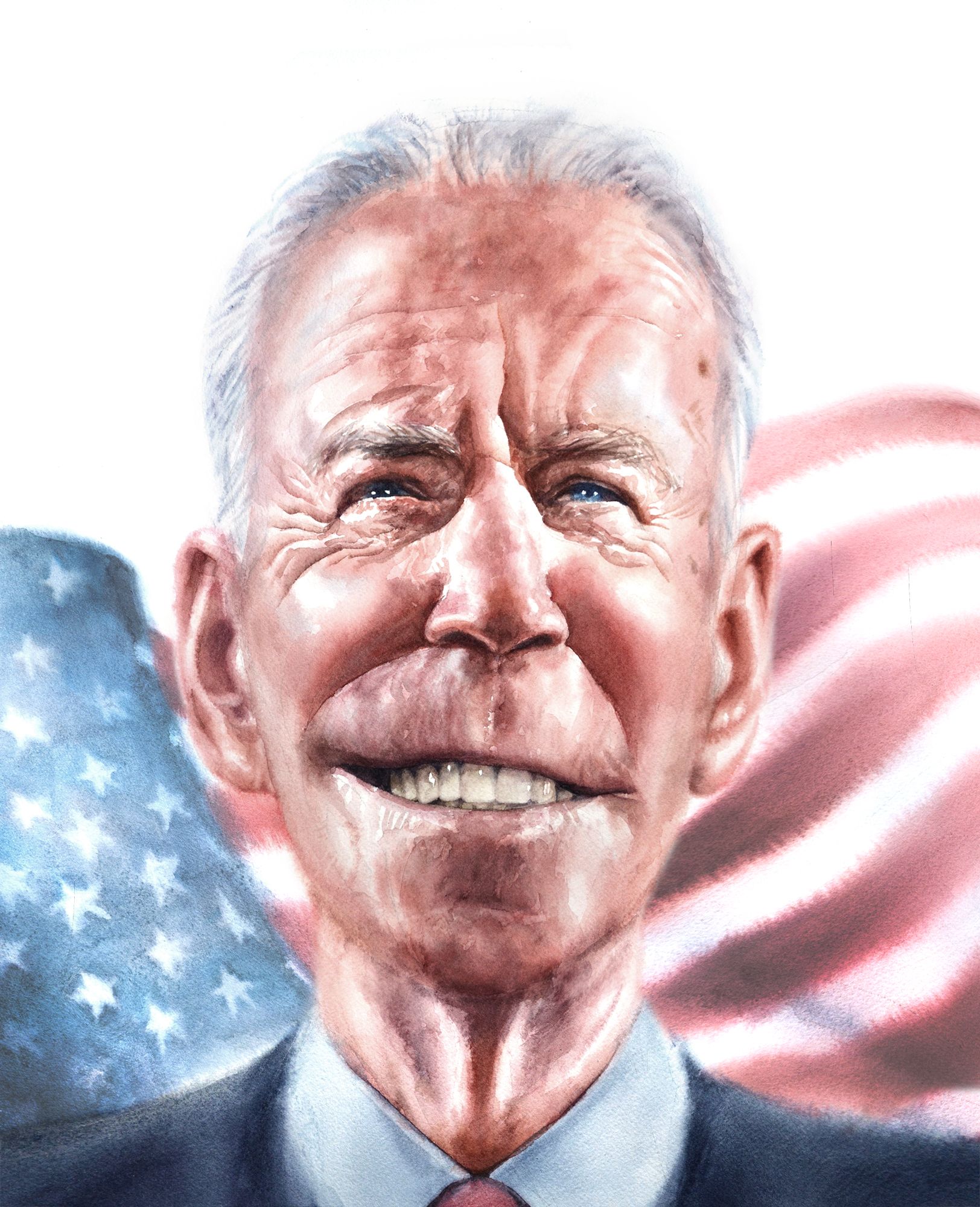 Tuve un día para hacerla y ninguna certeza de que fuese a ganar. Como muchos compañeros de profesión, deseaba que Trump desapareciera del panorama político y no tener que dibujarle más, y de ahí viene esa expresión alegre y segura, y hasta de alivio. Cuando trabajas con tan poco tiempo, la espontaneidad a veces cuenta más de lo que tú mismo te propones, y al terminarla pensé que me recordaba en algo a las pieles rosadas de las pinturas de Norman Rockwell, que es todo un referente de ilustración política americana. Es curioso cómo la cabeza combina influencias de manera casi automática.