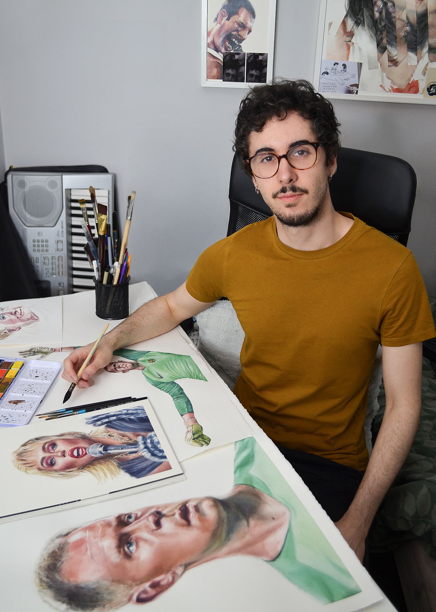 Cuando recibo un encargo es como que se activa una cuenta atrás: a veces tengo unas horas para resolverlo, a veces un día, pero rara vez más tiempo. Esto hace que tengas que agilizar mucho el proceso, así que lo que hago es ponerme a buscar imágenes del personaje que me piden y las guardo en una carpeta en el ordenador para tener varias opciones. Normalmente escojo un par de imágenes para combinar para no ceñirme demasiado a la fotografía, y una vez lo tengo claro me pongo a pintar directamente sobre el papel de acuarela, para ahorrar tiempo, por lo que el boceto suele convertirse en el dibujo final.