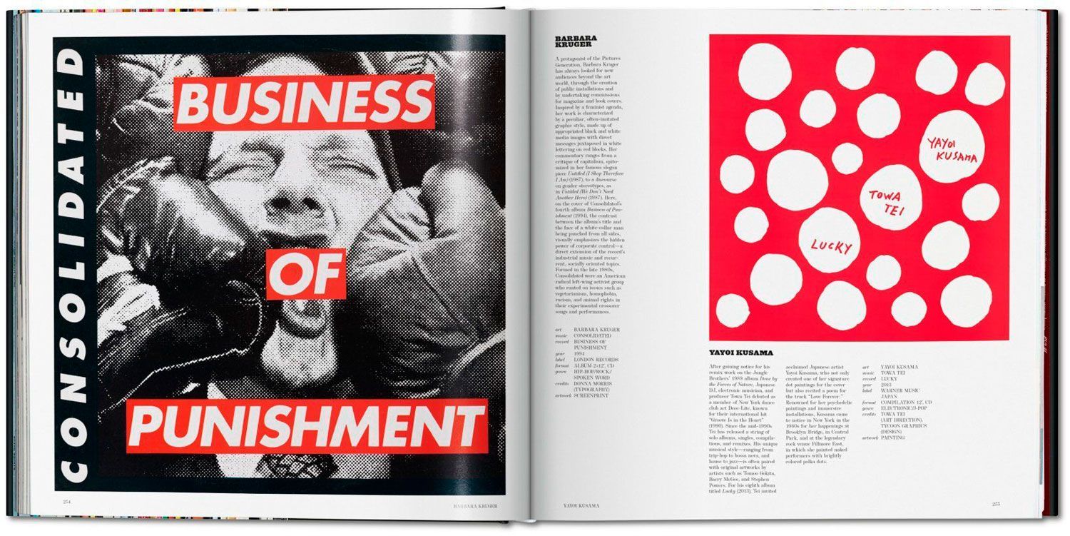 Algunos de los nombres que se pueden leer entre las páginas de este libro son el de Jean-Michel Basquiat, por el trabajo realizado para su propio sello discográfico (Tartown); Salvador Dalí, por su diseño para Lonesome Echo, de Jackie Gleason; Banksy y el grafiti usado en el Think Tank de Blur; Damien Hirst para The Hours; Keith Haring; Yayoi Kusama...