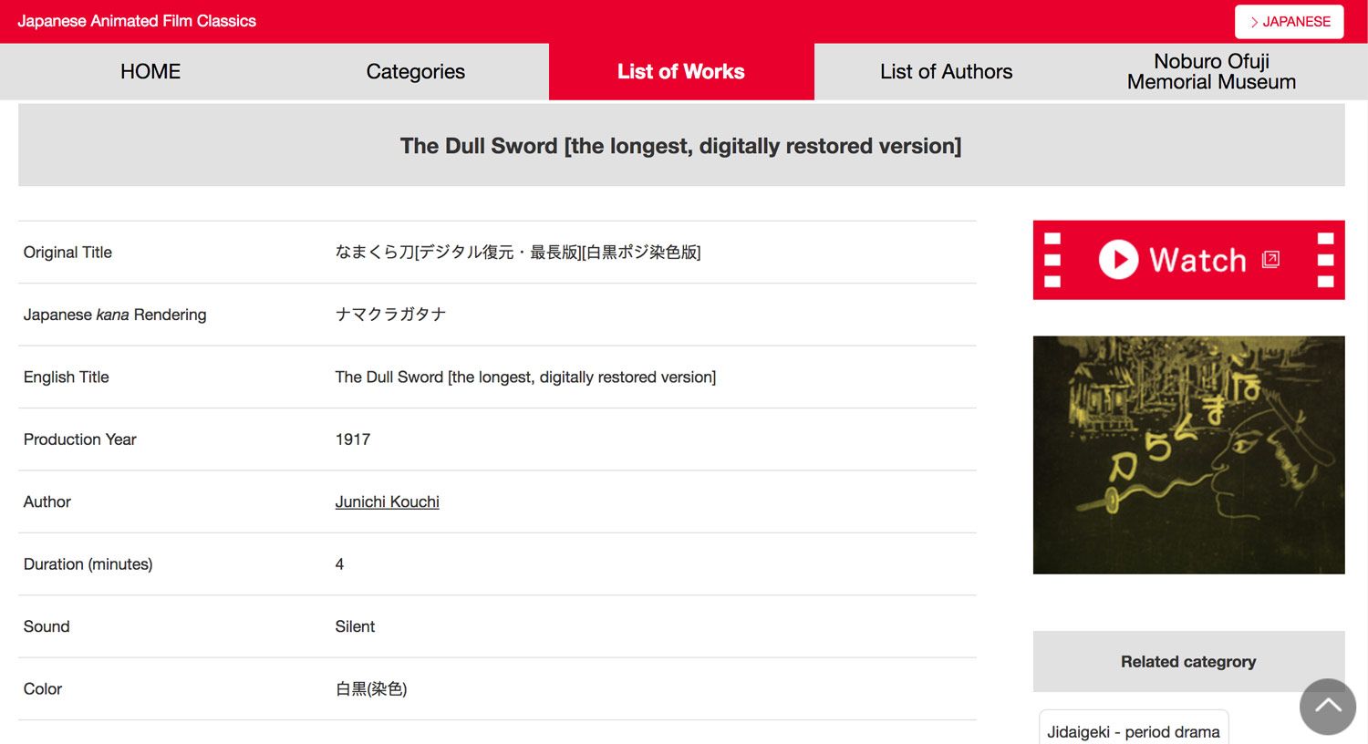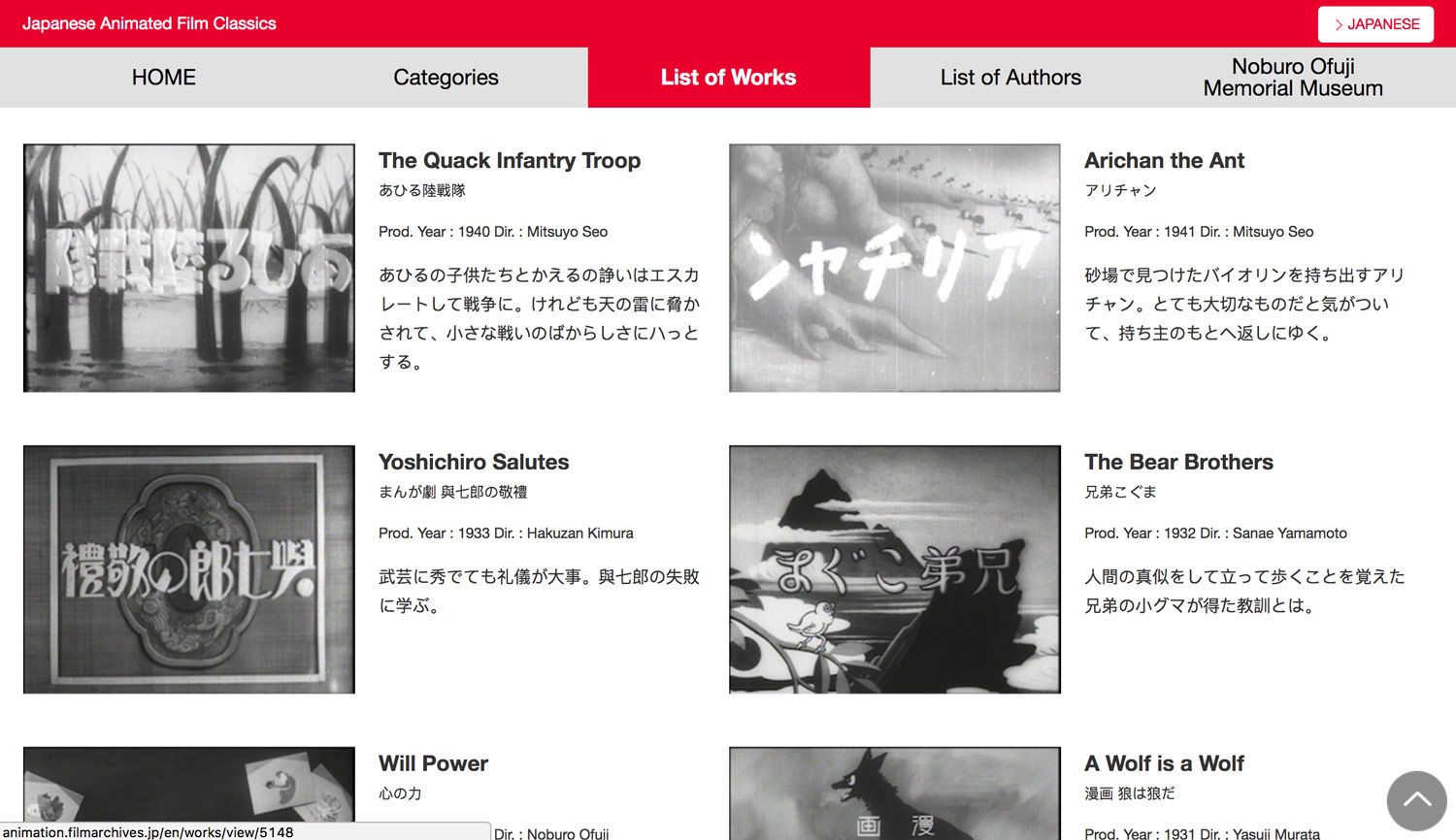 La web de Japanese Animated Film Classics, que estará disponible hasta final de 2017, permite filtrar los cortos de animación según diferentes criterios y adjunta subtítulos en inglés.