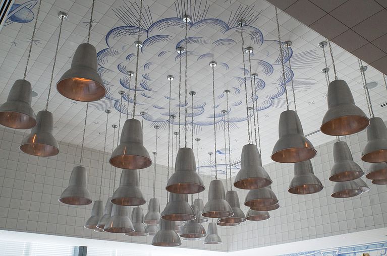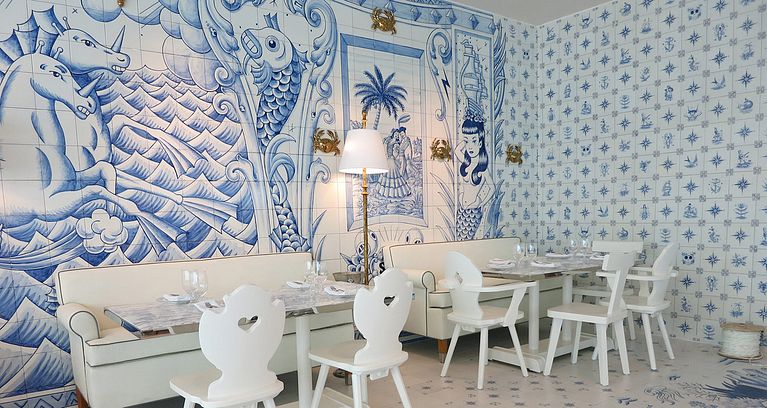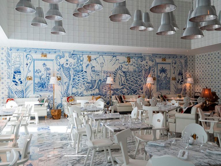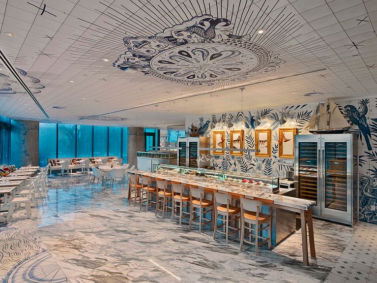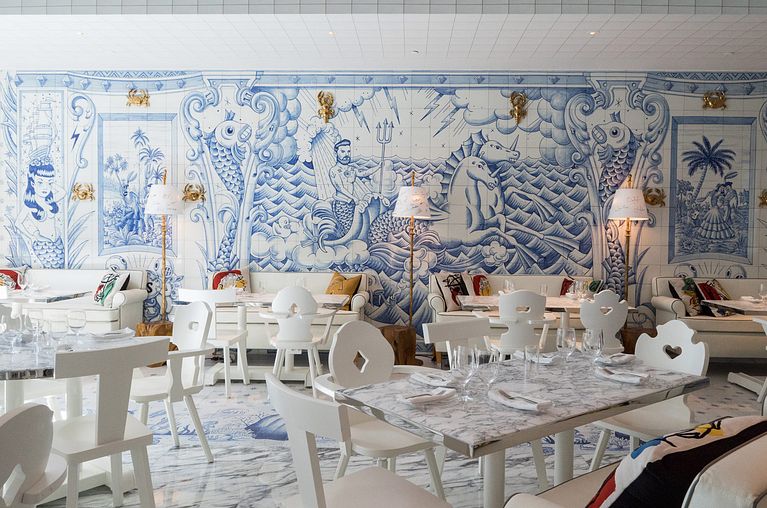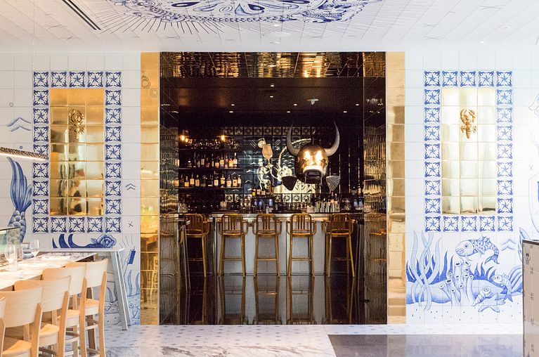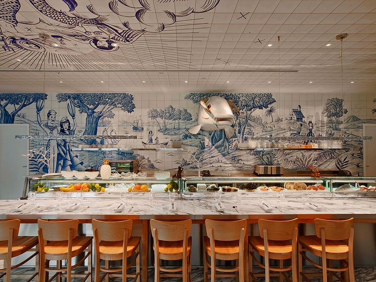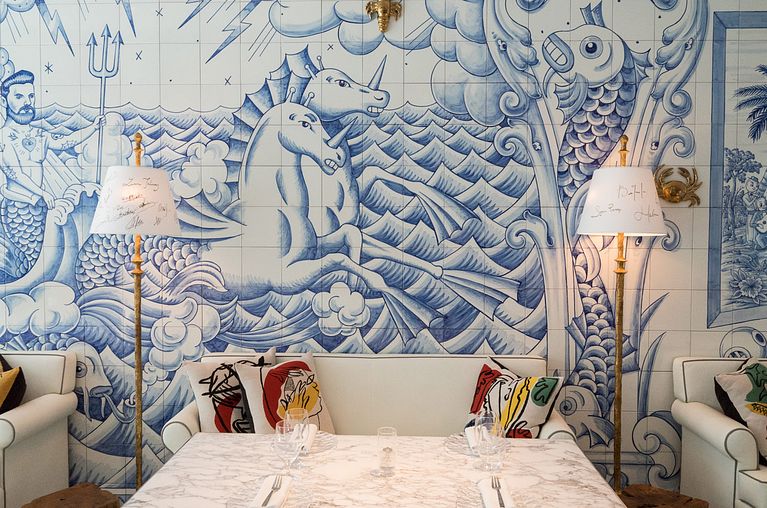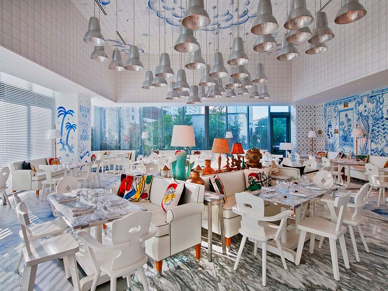 Infinidad de azulejos con motivos decorativos en azul bañan las paredes del nuevo restaurante del chef José Andrés en Miami, al más puro estilo tradicional portugués. A petición del celebérrimo Philippe Starck, el ilustrador español Sergio Mora ha diseñado todos y cada uno de los 6600 baldosines que otorgan un aire fresco y divertido a un espacio pensado para disfrutar de las bondades gastronómicas provenientes del mar.