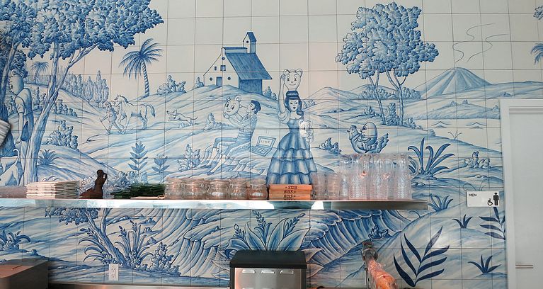 Miles de azulejos ilustrados por Sergio Mora decoran cada rincón del nuevo restaurante de moda en Miami.