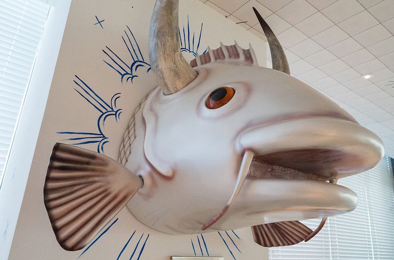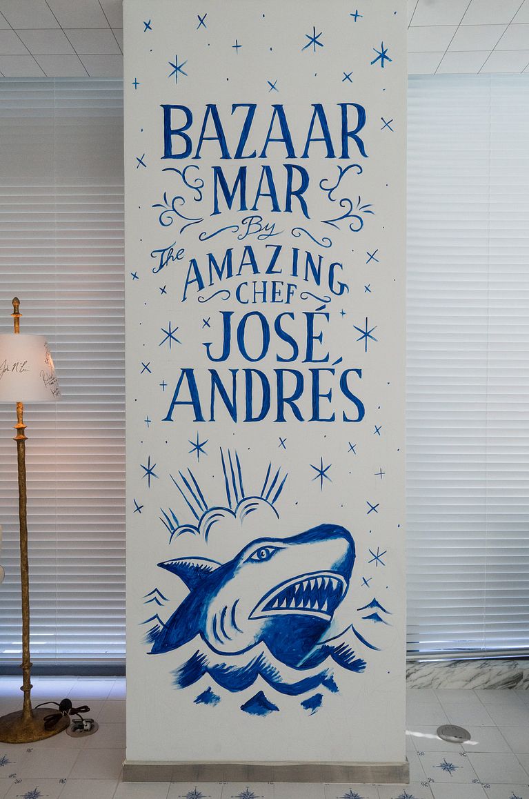 El mismo día que Sergio Mora recibía el premio Grammy Latino al mejor packaging por la portada del disco Poeta Halley del grupo español Love of Lesbian, abría las puertas Bazaar Mar. El ilustrador español, que recibió el encargo de los propios Philippe Starck y Bruno Borrione, encargados del proyecto, tuvo desde el inicio total y absoluta libertad para alicatar el espacio con sus ilustraciones del suelo al techo, y no dudó en incluir buzos toreros o sirenas comiendo paella bajo el mar mientras hablar por su smartphone.