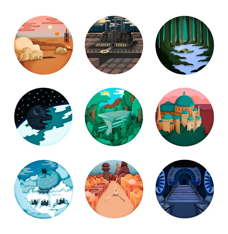 La ilustradora Lucía Gómez ha centrado su atención en los espectaculares escenarios que coprotagonizan las películas de Star Wars y les ha dedicado un proyecto de diseño vectorial en el que muestra nueve localizaciones diferentes.