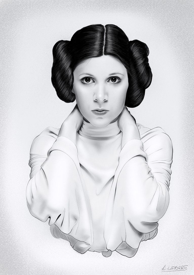 El de Alicia Latorre es otro de los ejemplos de ilustraciones, en este caso en blanco y negro y de corte realista, creadas para honrar la muerte de la que para todos los fans de Star Wars, será siempre la Princesa Leia.