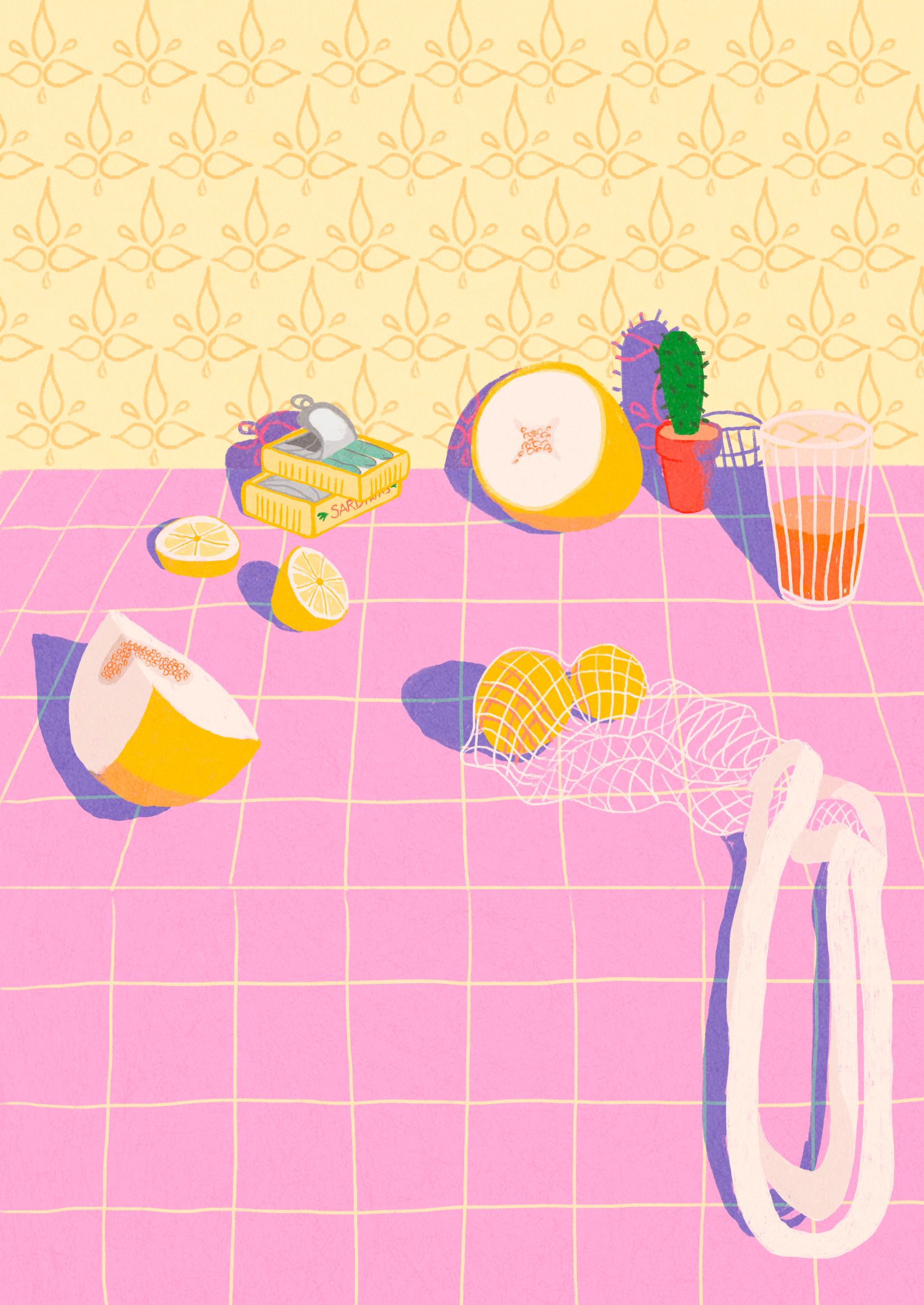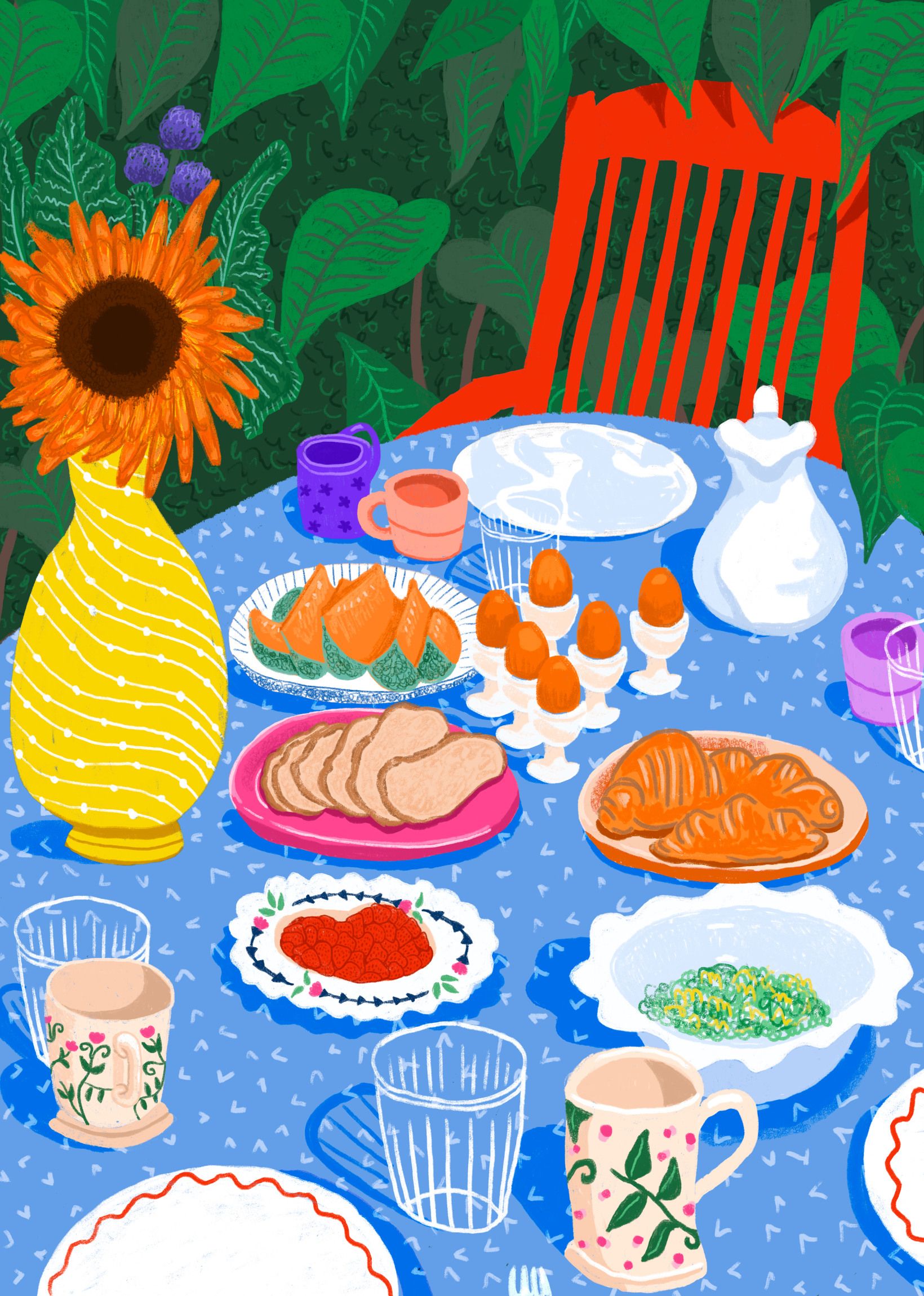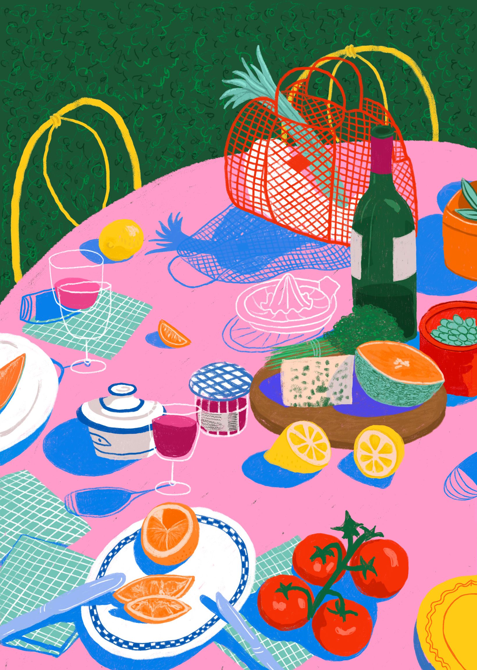 Platos llenos de frutas recién cortadas, desayunos en el jardín a la luz de la primavera o fiestas en la mesa para celebrar cualquier momento. A Gisele le divierte mucho hacer ilustraciones de comida porque le permiten explorar las posibilidades de los colores y las formas.
