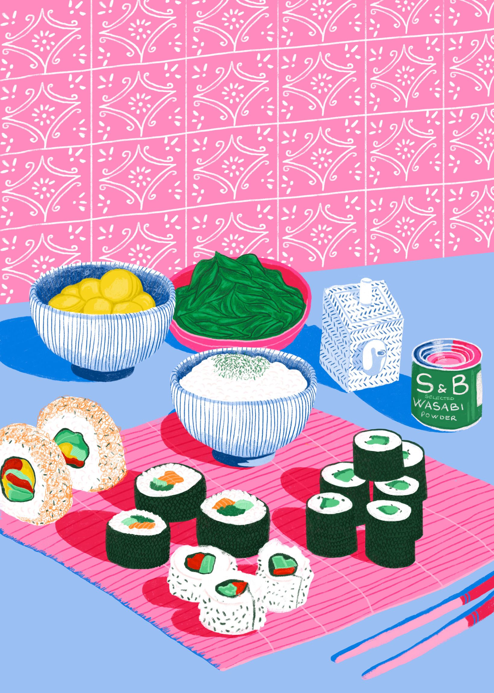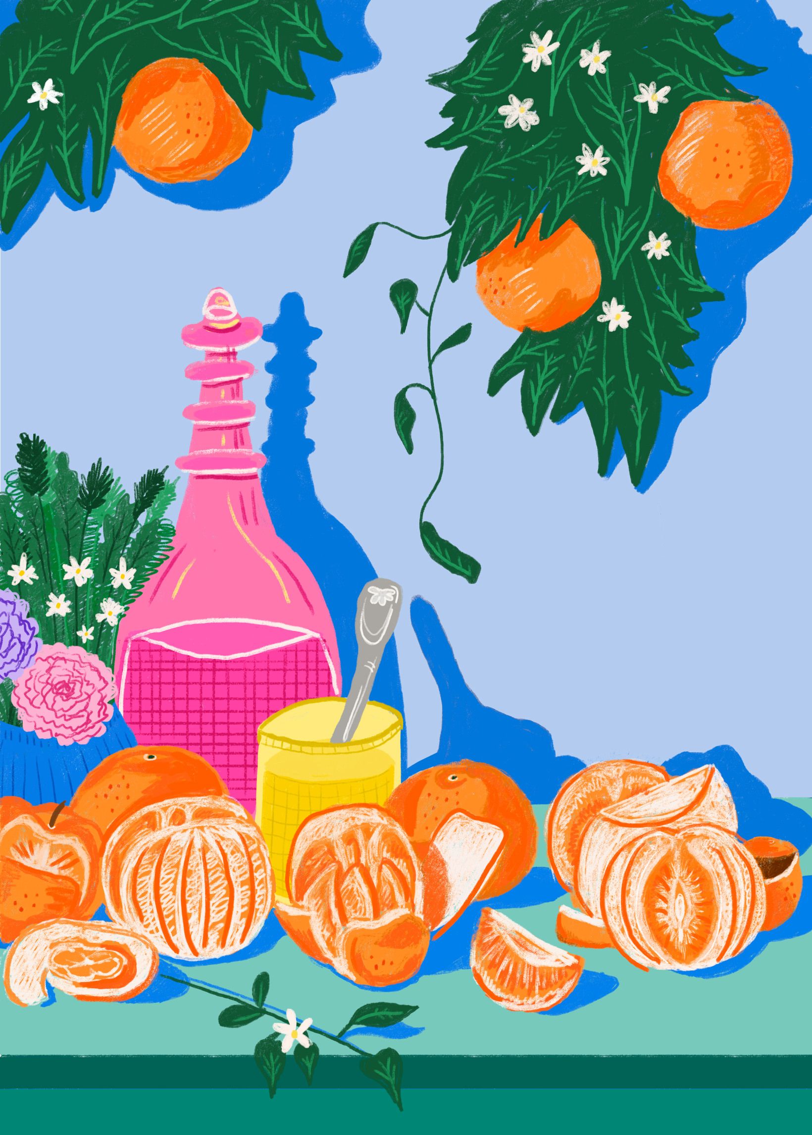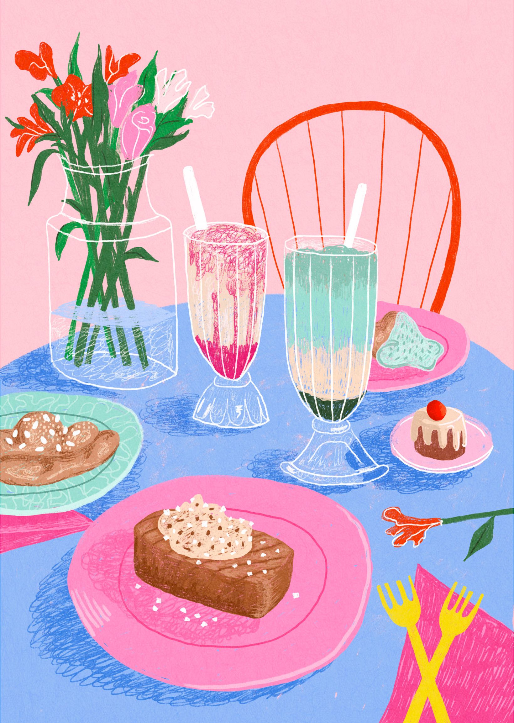 Platos llenos de frutas recién cortadas, desayunos en el jardín a la luz de la primavera o fiestas en la mesa para celebrar cualquier momento. A Gisele le divierte mucho hacer ilustraciones de comida porque le permiten explorar las posibilidades de los colores y las formas.