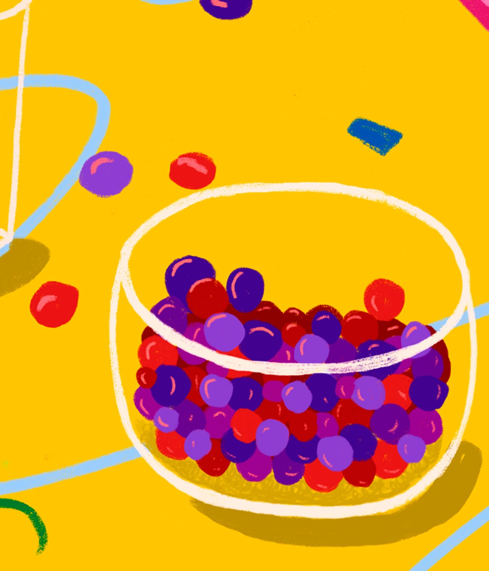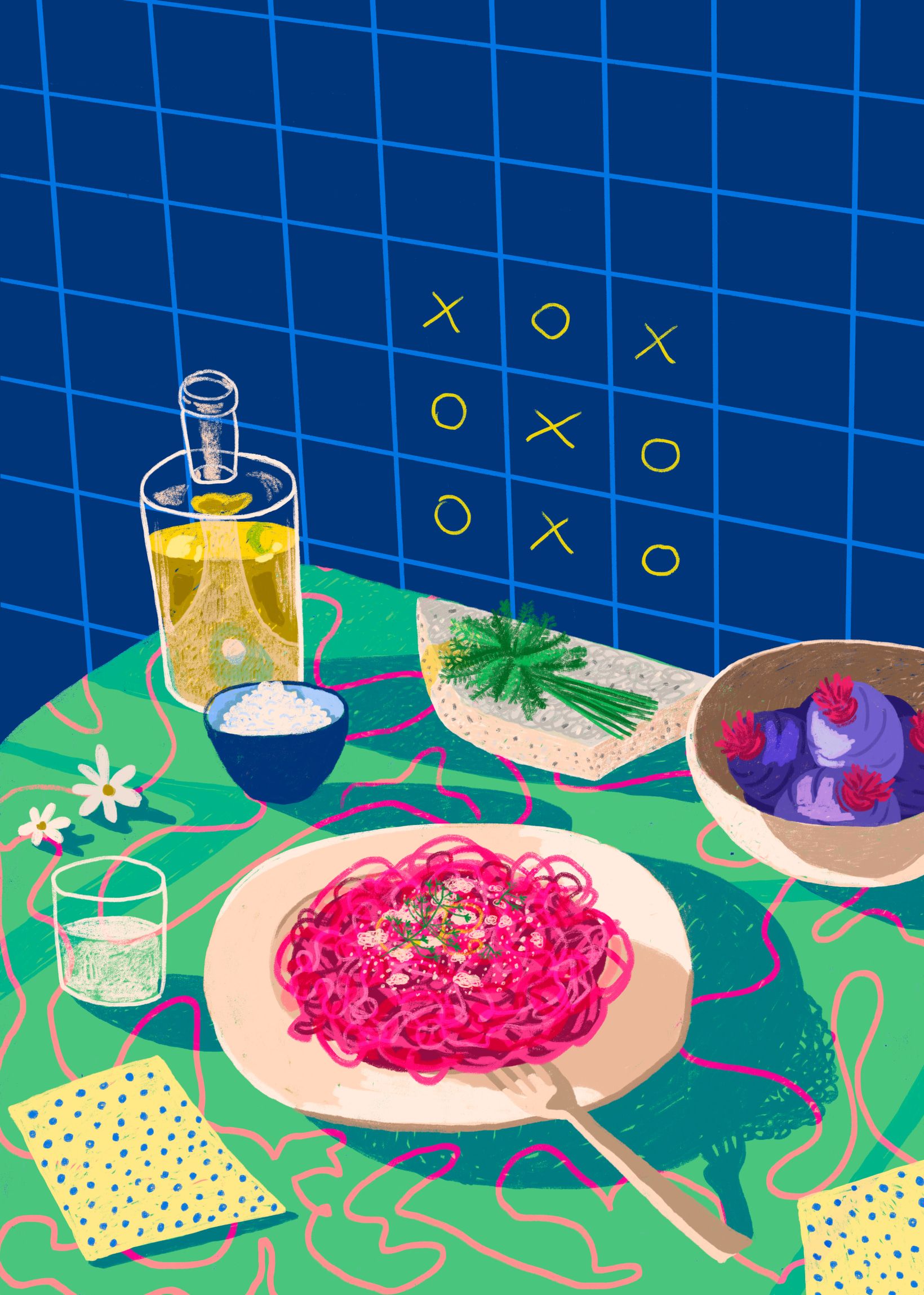 Siguiendo con los bodegones de comida divertida, la mesa de Food Party es el resultado de explorar la versatilidad de la paleta con la que llevaba meses trabajando. Además, con la particularidad de que toda la ilustración está hecha con un único pincel de Photoshop.