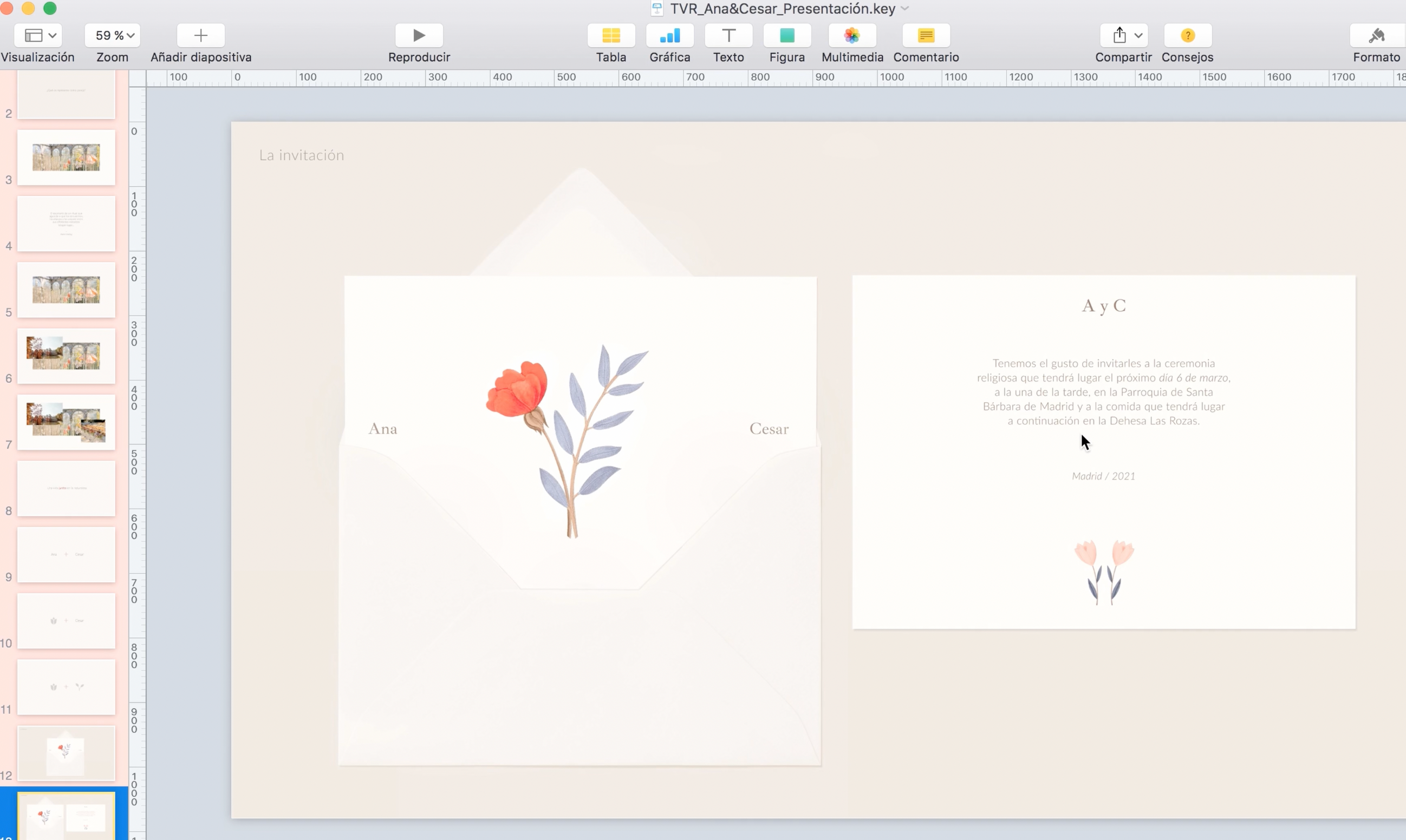 María, fundadora de The Visual Romance, se dedica al mundo del diseño gráfico y el branding, especializándose en proyectos relacionados con eventos como las bodas. Para diseñar unas invitaciones nupciales, María pasa por muchas fases que van desde pensar el concepto hasta elegir el papel. Todas esas decisiones son las que luego compartirá con sus clientes. Además, también tiene que diseñar la propia presentación, es decir, el documento donde irá reflejando todo el proceso creativo.