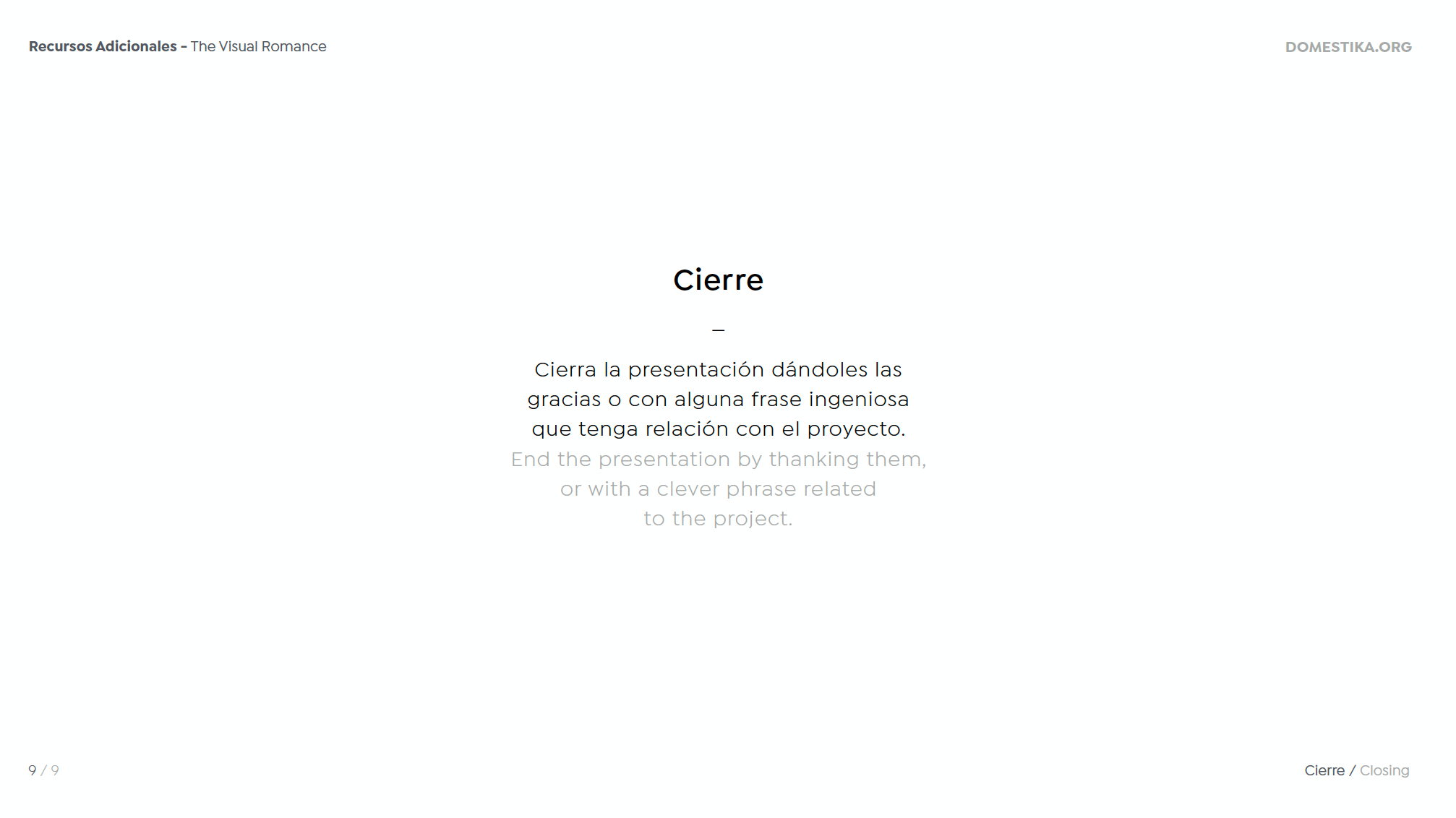 - No te olvides del cierre: termina la presentación con alguna frase ingeniosa o un comentario que tenga relación con el proyecto. Incluso alguna sensación de lo que te ha aportado a nivel profesional y/o personal.