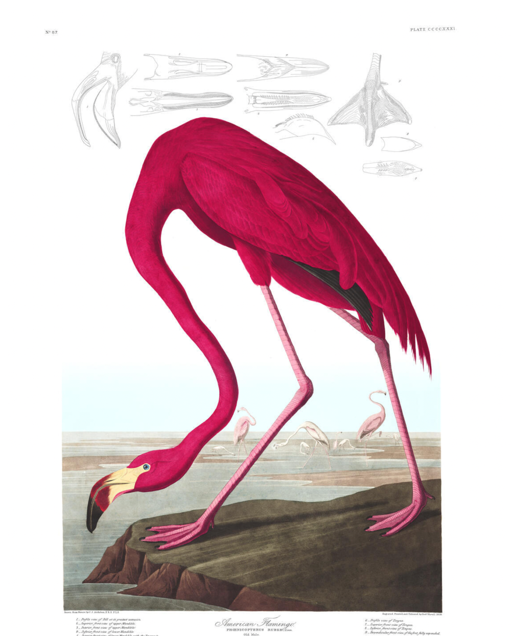 Su idea era vender los grabados por suscripción en fascículos de cinco. Para hacerlos atractivos, decidió que tenía que presentar los pájaros a su tamaño real. Audubon utilizó el formato de papel más grande disponible por aquel entonces, el doble elefante: 977 x 645 mm. Por eso, las aves que tienen más de un metro, adoptan extrañas posturas en algunos casos.