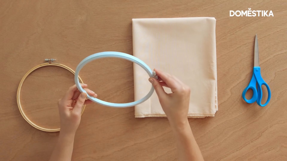 Coloca la parte interna del aro sobre tu superficie de trabajo cuidando de mantener el labio hacia arriba. Pon tú tela y después coloca el aro exterior encima. Necesitarás ajustar el tornillo del aro exterior para que coincida con su contraparte.