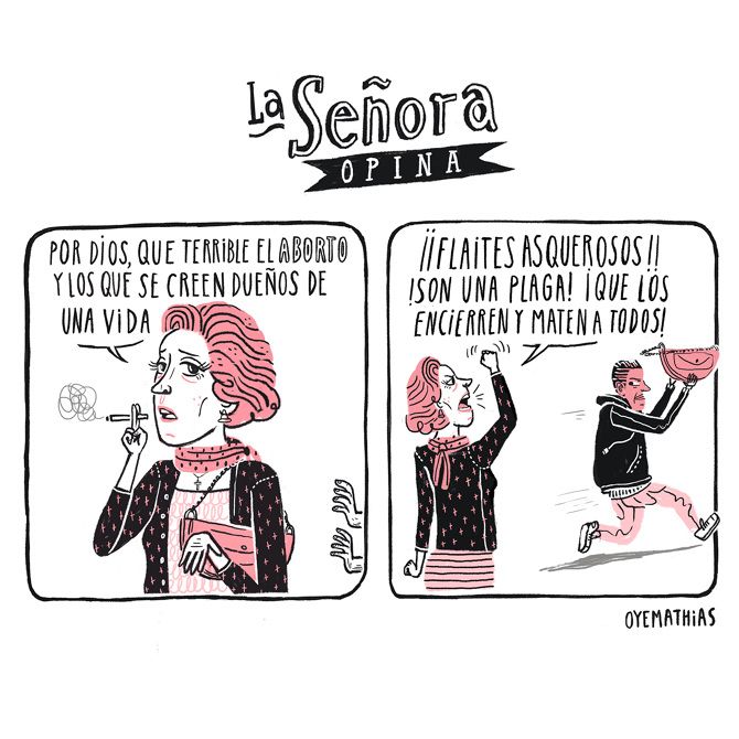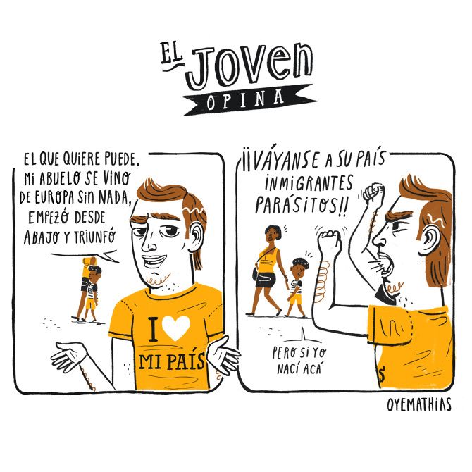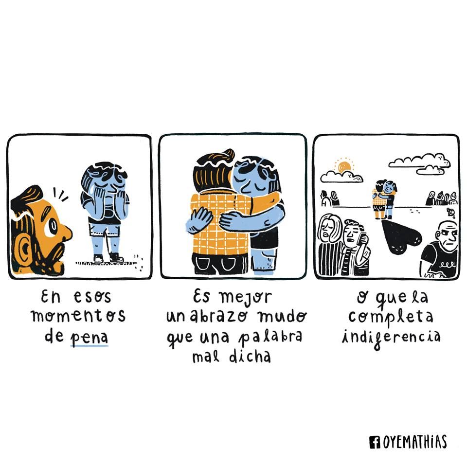 El talento de Mathias no sólo está en la parte gráfica sino en cómo plantea los problemas que la sociedad tiene y sobre todo, consigue que hagamos un ejercicio de auto-cuestionamiento (¿qué tantas veces hemos opinado sin conocer o hemos sido empáticos con el otro?); esto denota su gran creatividad e interés por un mundo mejor.