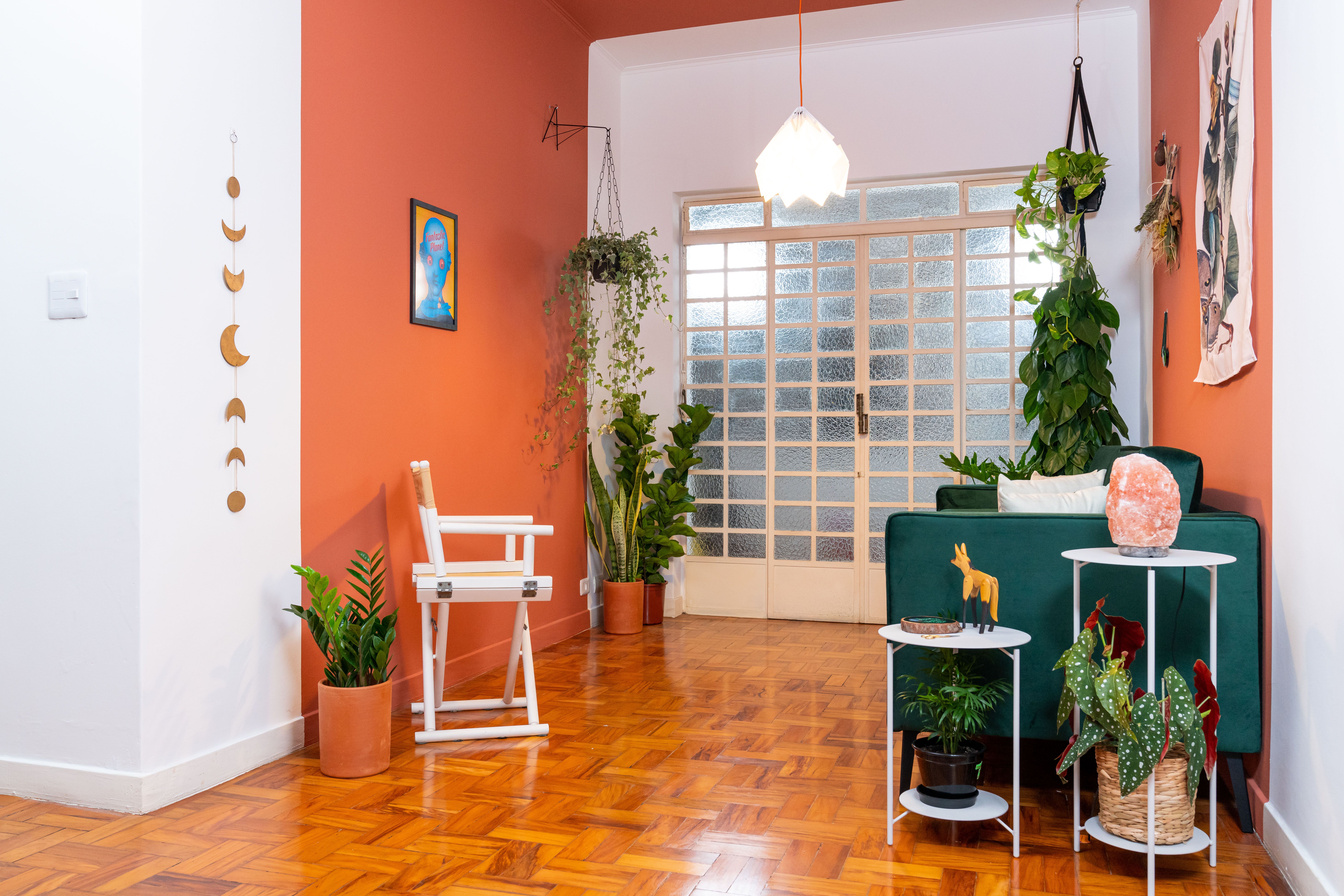 El primer paso para cualquier proceso de decoración con plantas consiste en preparar el ambiente con muebles y una pintura mural que, idealmente, pueda generar un contraste armonioso con el verde de las plantas.