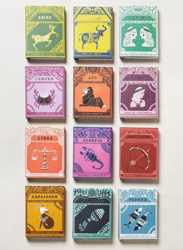 Esta artista y diseñadora avecindada en Nueva York emplea un estilo divertido y juguetón, al igual que su amor por los colores brillantes, para diseñar este elegante Zodiaco impreso en portadas de cuadernos.