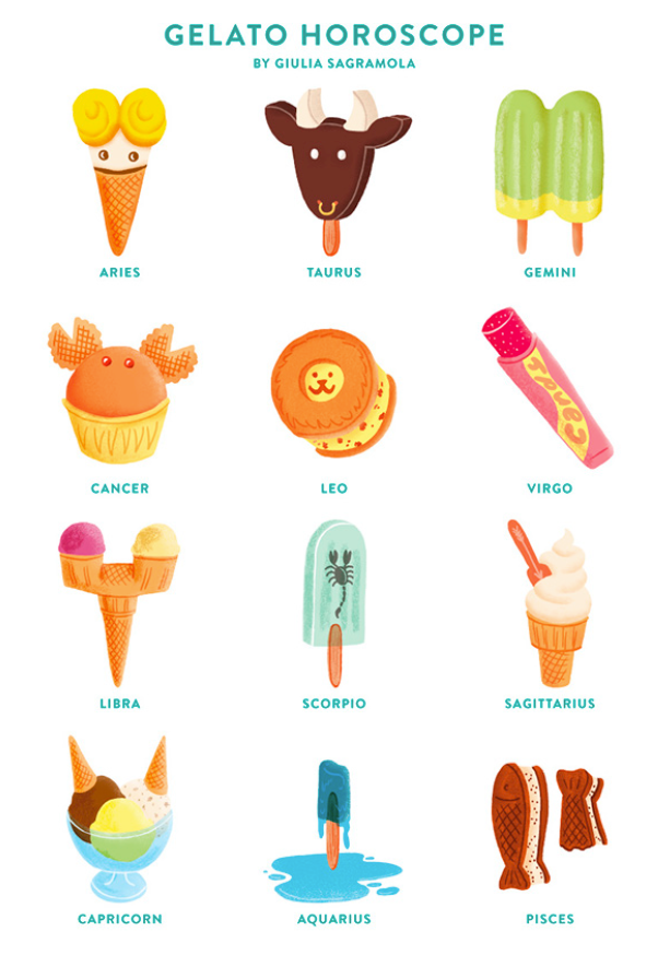 La ilustradora, caricaturista y diseñadora Giulia Sagramola recurrió a una interpretación más juguetona del Zodiaco, tomando a los helados como fuente de inspiración.