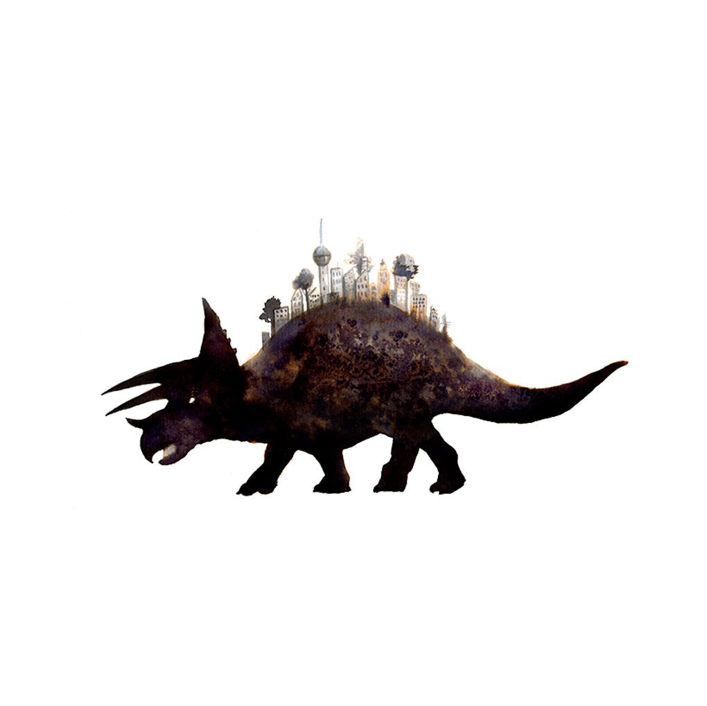 Como parte de la experimentación con materiales, Adolfo Serra ha creado una colección de ciudades a lomos de dinosaurios jugando con tintas y acuarelas.
