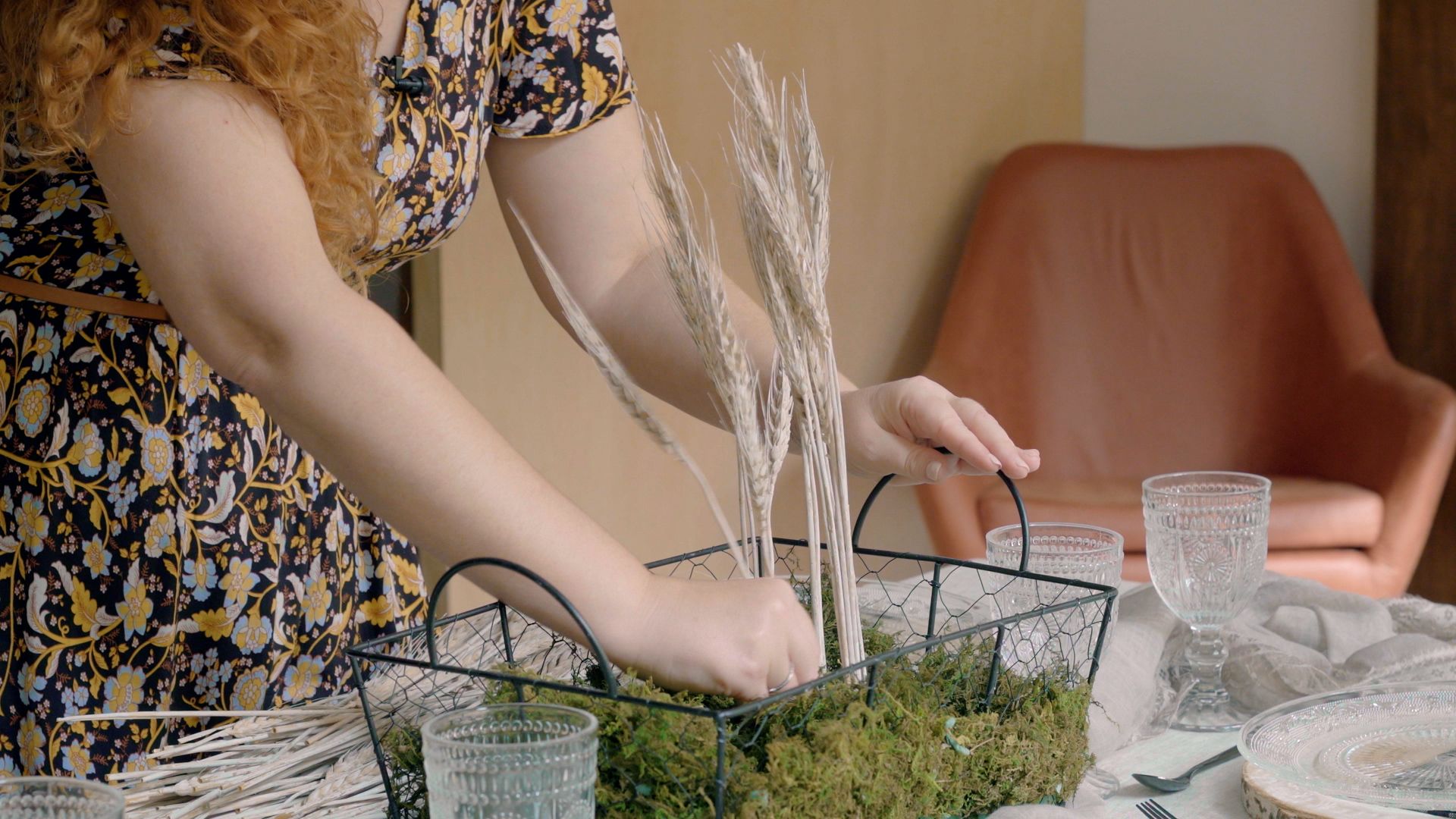 Por último, llega el turno de la decoración. A Estela le gusta utilizar pañuelos, telas y caminos de mesa para darle un toque especial. en esta ocasión, la decoradora ha confeccionado un centro de mesa con dos elementos característicos del farmhouse: malla de granero y trigo.