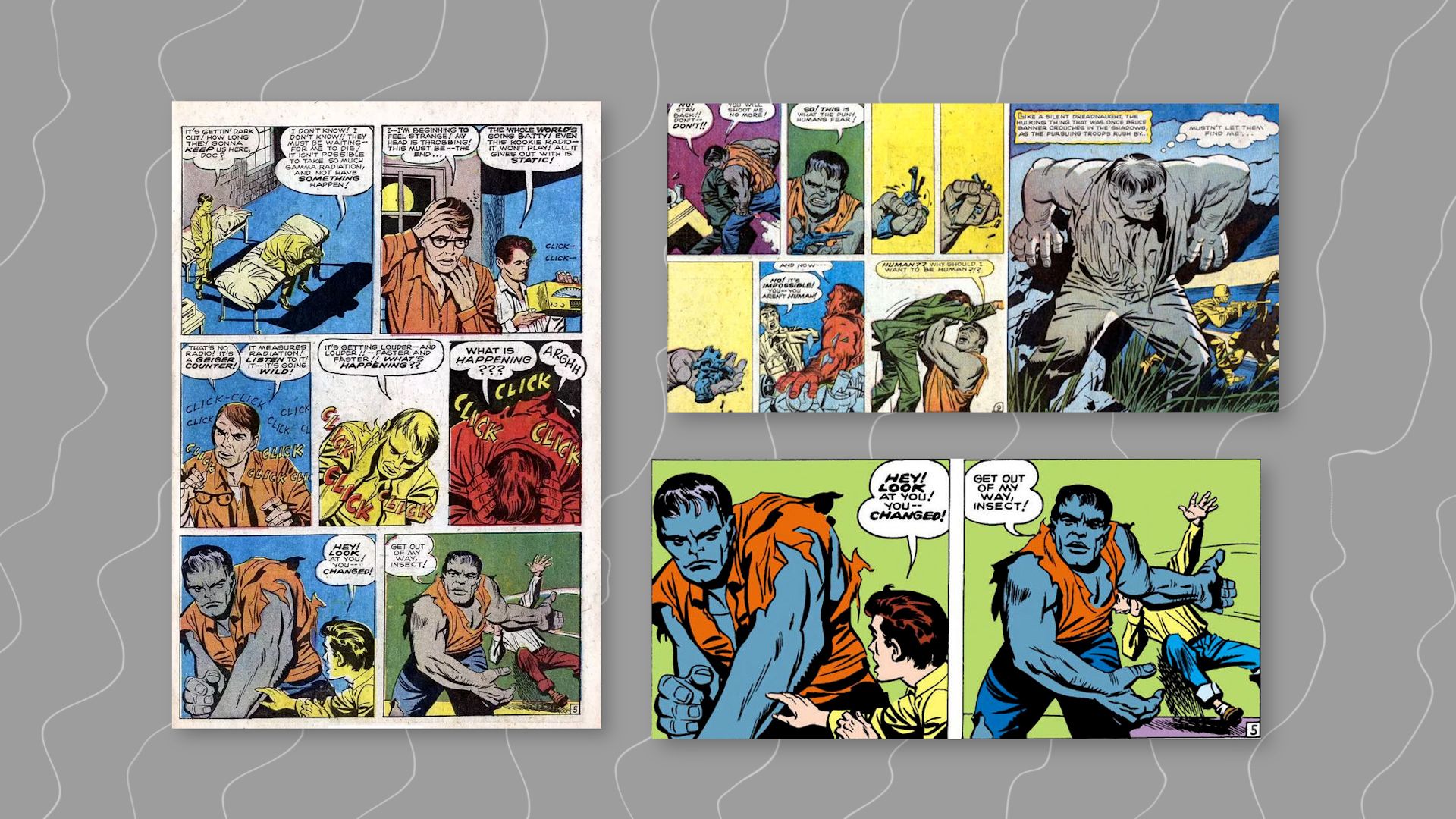 El color verde es algo tan asociado a Hulk como su legendario mal carácter. Pero este color es solo fruto de un error. En un principio, el Hulk creado por Stan Lee y Jack Kirby y cuyo primer número se publicó en 1967 era gris. Pero la tecnología de impresión hizo imposible imprimir el color de forma uniforme y en cada página aparecía un tono de gris diferente.