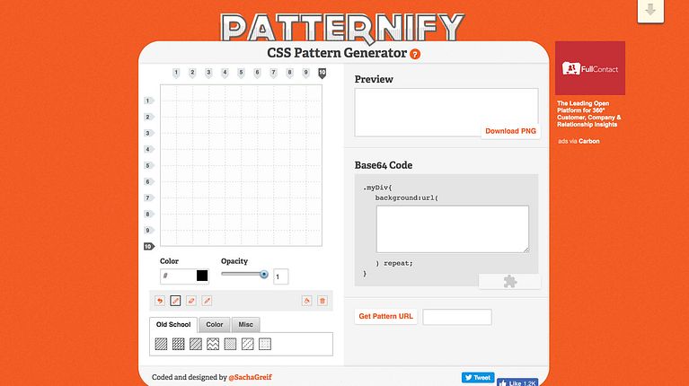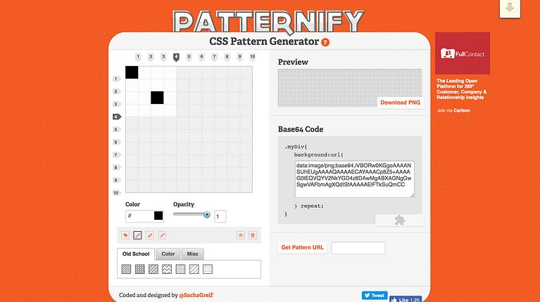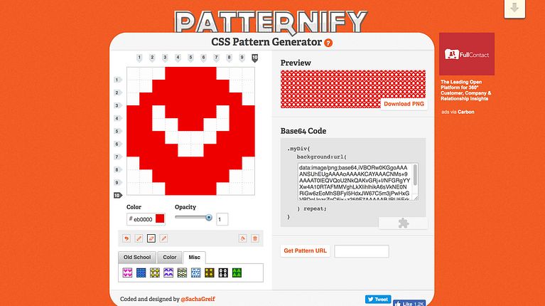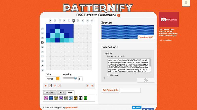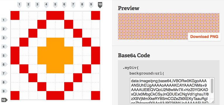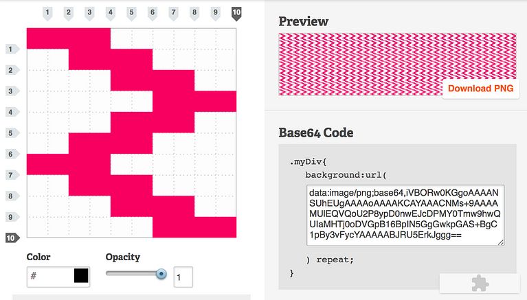 El resultado, en este caso, será siempre un pattern con efecto pixel art, pero no por ello menos interesante. Al tiempo que vamos creando nuestro diseño, podemos ver el pattern final en tiempo real en la casilla superior derecha. Una vez que estemos satisfechos con el resultado, solo tendremos que copiar el código CSS generado y usarlo en nuestra web. También es posible descargar el diseño en formato .png; para ello hay que tener en cuenta que, una vez descargada la imagen, hay que renombrarlo y agregarle la extensión para que funcione correctamente.