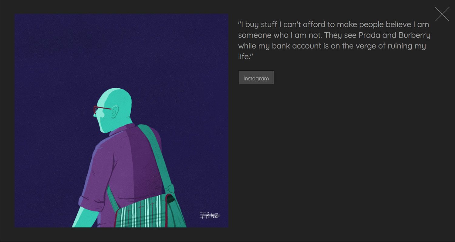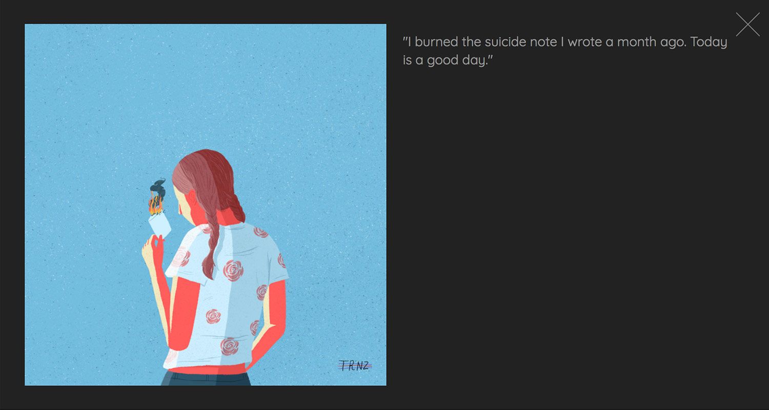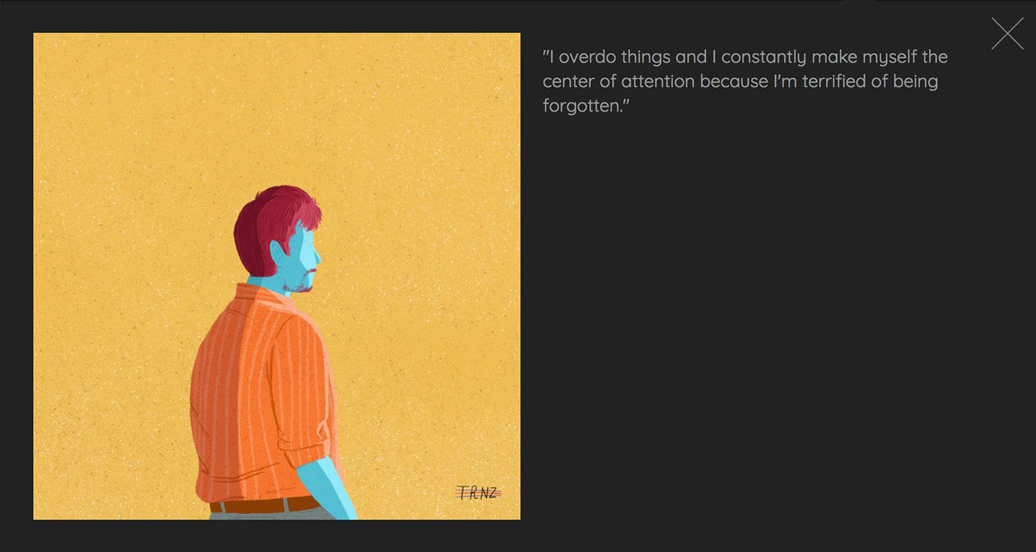 Durante los 100 días que duró el proyecto, Terence recopiló los pensamientos ocultos de familiares, amigos y auténticos desconocidos, para plasmarlos sobre el papel en forma de retrato anónimo. Más de tres meses en los que compartió en sus redes sociales un secreto diario.