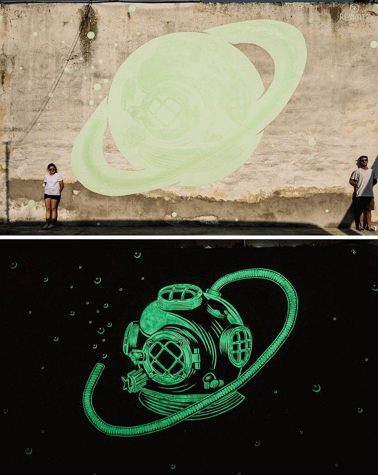 Reskate son Maria López y Javier de Riba, dos jóvenes españoles que están poniendo patas arriba el mundo del arte urbano con sus murales, creados con tintas especiales y que revelan nuevos diseños cuando las luces comienzan a desaparecer.