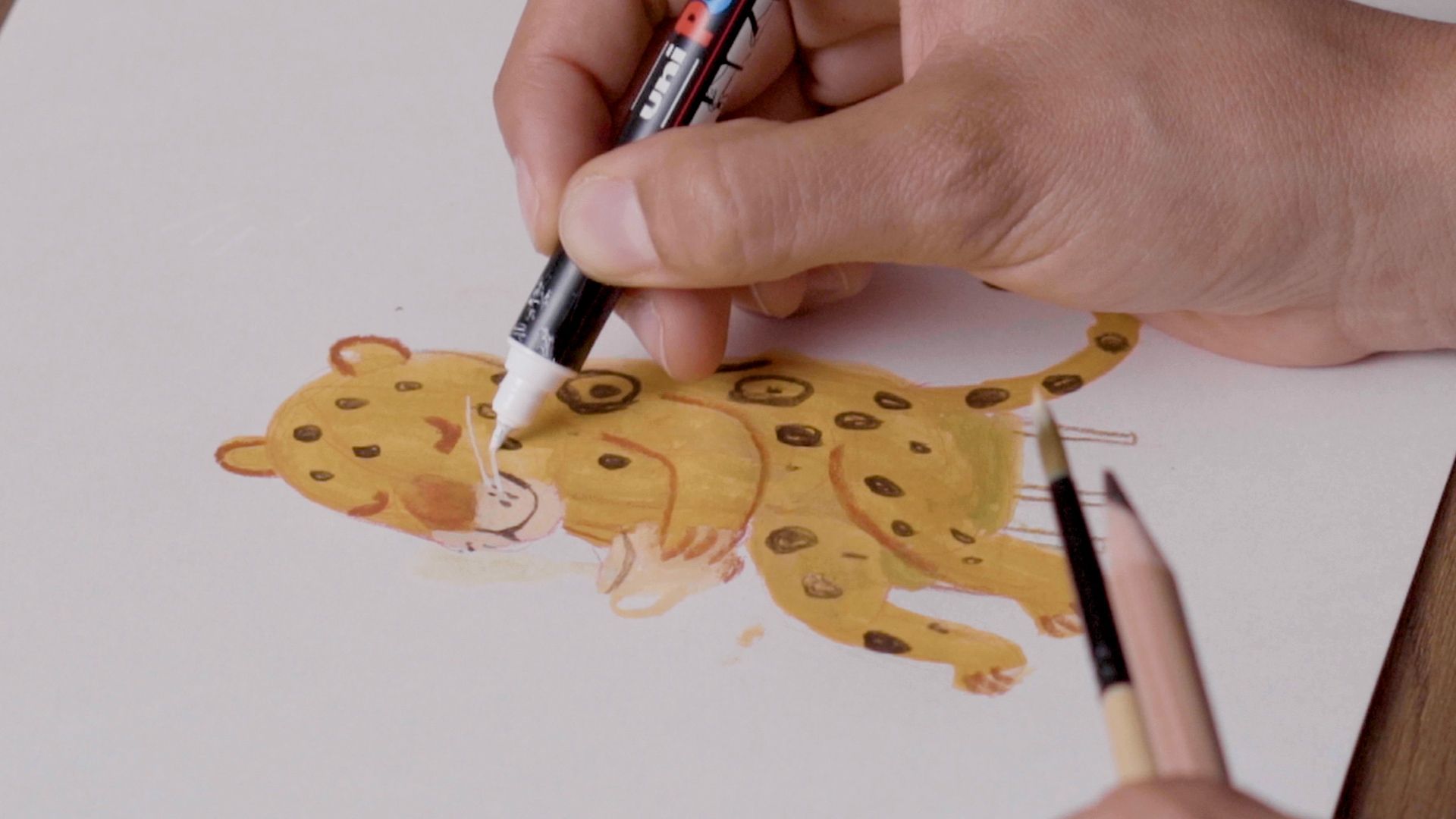 En este caso concreto, Manu utiliza gouache para pintar el jaguar, ya que es la técnica que más domina. Además, en el caso de este tipo de ejercicios que exigen rapidez, el gouache es una buena opción ya que seca rápidamente.
