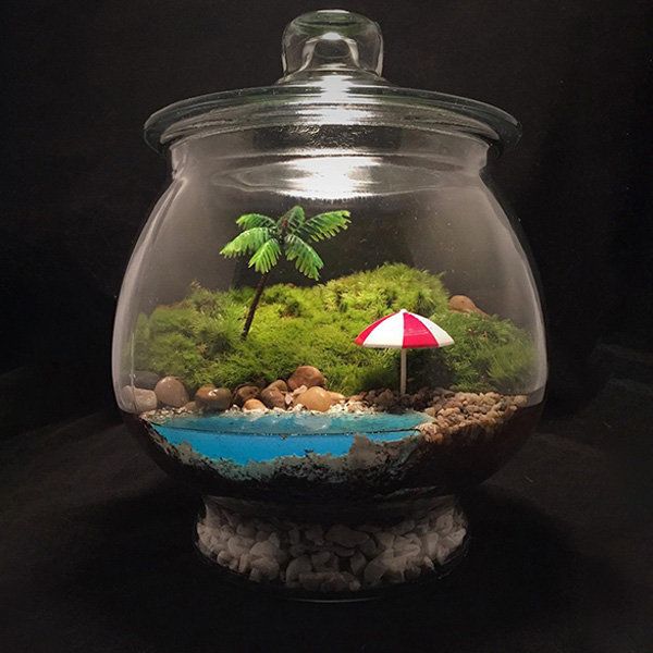 Una vez que dominan la compleja técnica de crear ecosistemas, muchos artistas se atreven a crear escenas y paisajes dentro de sus terrarios. Ellos buscan dar vida a escenas en las que todos querríamos entrar: playas tropicales, selvas con cascadas y praderas floridas. En ocasiones, incorporan la presencia humana y crean situaciones igual de seductoras: vacaciones con amigos, paseos en veleros y clases de yoga al borde del mar.