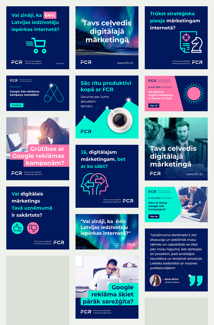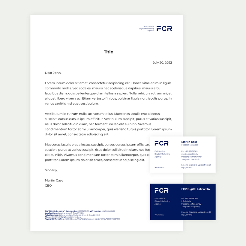 Regarding the logo, we decided to keep the "FCR" abbreviation as it was well-known, but removed the word "media" or "digital" from the design to focus on the short name. To make it visually unique, we created custom letters and made them legible in small formats, which is important in social media. The category name can be included in the logo if needed, depending on the context, to avoid clutter around the beautiful logo letters.