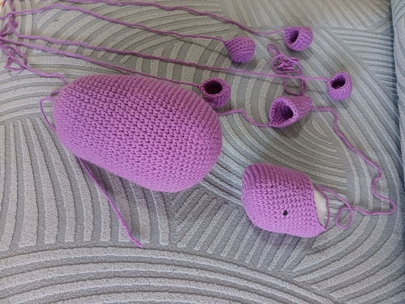 2 ovillos de algodón, una aguja de crochet, una aguja lanera y relleno