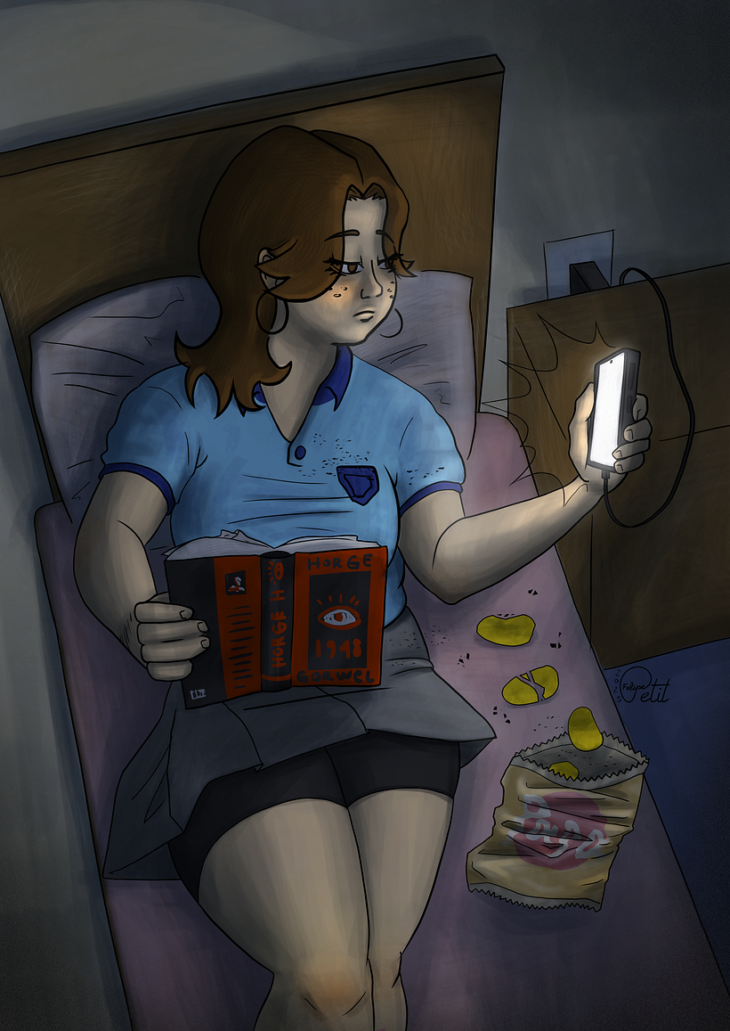 La verdad es que partí con thumbnails y quedo este dibujo de ella en la pieza. Me pareció una escena llamativa porque es común y creo que el/la espectador/a se va a sentir reflejado/a.