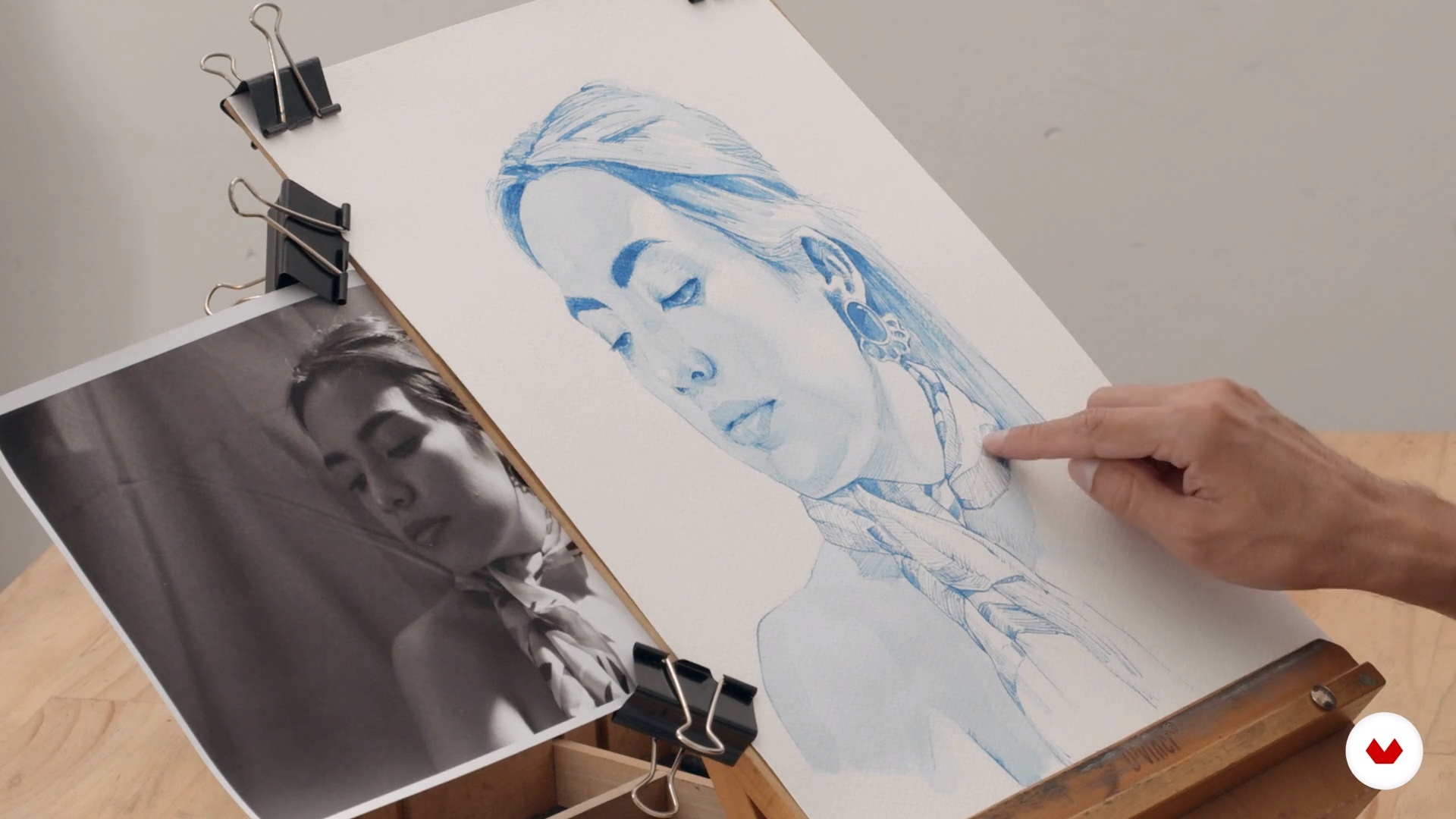 “En esta lección extra, te enseñaré a usar la tinta como una técnica alternativa para el dibujo de retrato. Veamos los materiales que vamos a utilizar. un pincel para acuarela número 18 un recipiente con agua tinta del color que prefieras, en este caso yo usaré azul tres mezclas las dos primeras con mucha agua esta con poca agua y esta que es la tinta pura. Y finalmente una plumilla. Para empezar, ya tengo mi retrato boceteado y lo primero que voy a hacer es tomar del tono más claro aplicarlo sobre toda el área de sombra. Ahora con un poco de agua Voy a suavizar. los contornos Luego de reali...”