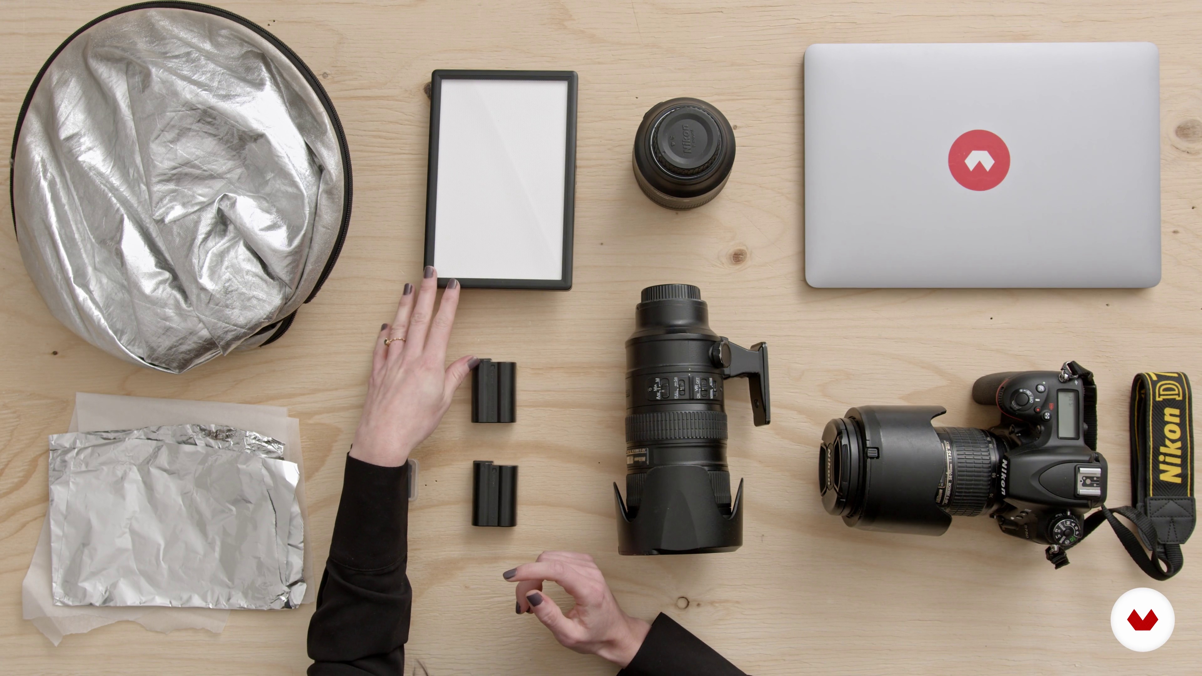 “En esta lección, quiero mostrarte mi equipo habitual para un rodaje. Cámara y lentes, reflector, lámina, computadora portátil, luz continua son algunas de las cosas que necesitarás.”