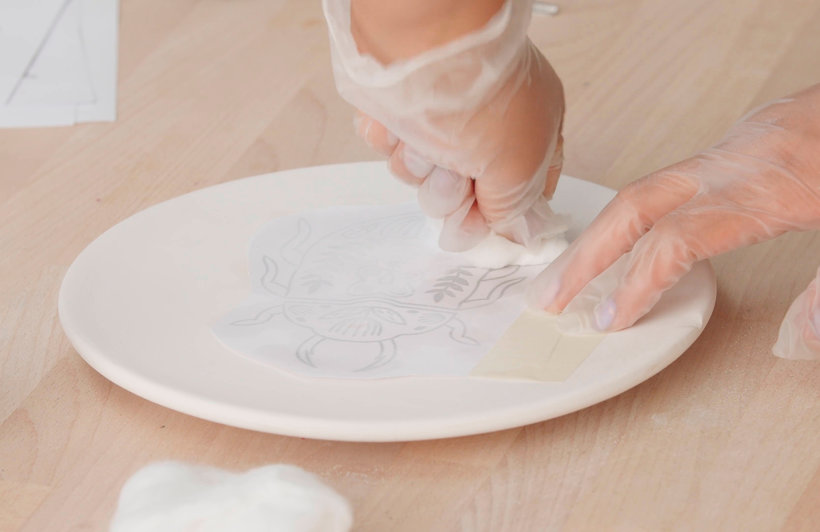 “Llegamos al final del camino. Ahora es el momento de recuperar todo lo aprendido y compartir nuestro proyecto final con la comunidad Domestika. A continuación, vamos a repasar las fases clave del proyecto. Vamos a hacerlo con el ejemplo de la técnica de transferencia directa, pero recuerda que tú puedes hacerlo con cualquiera de las tres técnicas que has practicado durante el curso; la que prefieras. Estaría genial que nos mostraras una o varias imágenes de cada fase de tu proyecto y que añadieras una breve explicación sobre lo que has hecho en cada una. Técnica y superficie El primer paso es elegir la técnica de transferencia que más te haya interesado de las mostradas en la Unidad 3: transferencia directa, transferencia fotográfica o transferencia con acetato. También deberás escoger una superficie sobre la que trabajar: cartulina, madera, tela, cerámica... En este caso, te mostramos nuestro proyecto realizado con la técnica de transferencia directa sobre un plato de cerámica bizcochada.