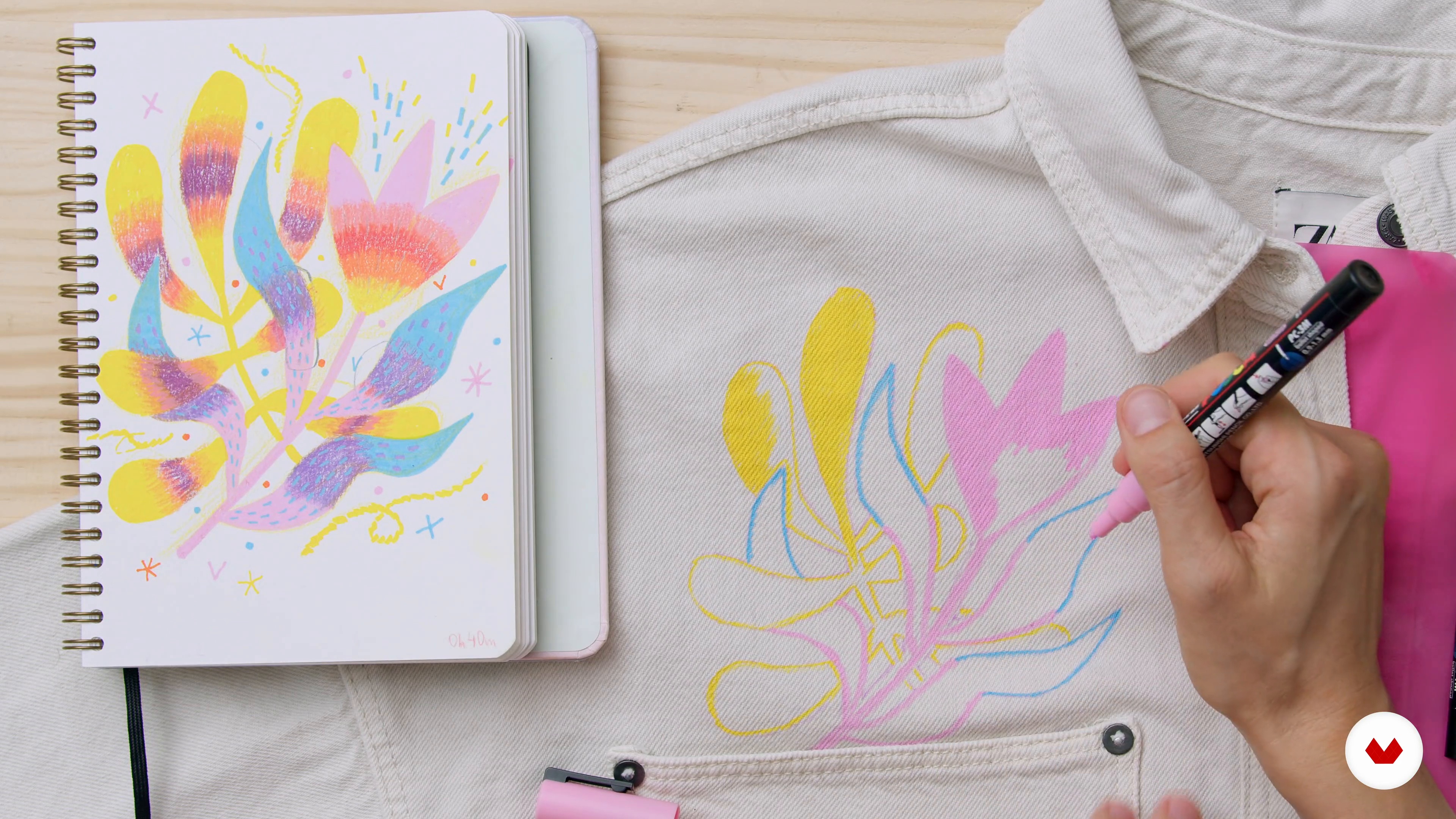 “Antes de comenzar, asegúrese de que su textil esté lavado y planchado. De lo contrario, puede alterar considerablemente su diseño. En esta lección, le mostraré cómo transfiero un diseño complejo a la tela utilizando la técnica del esténcil. Además, veréis como preparo mis rotuladores Posca para empezar a pintar. Una vez que haya completado estos pasos, deberá esperar un período de 24 horas antes de pasar a la siguiente etapa.”