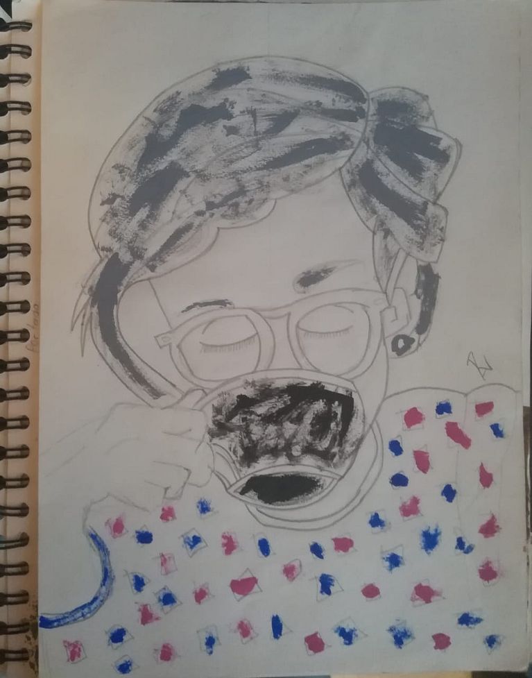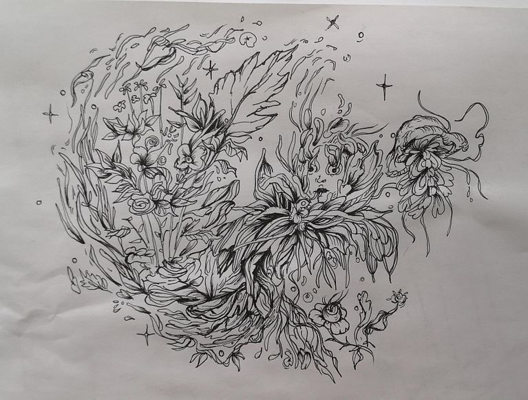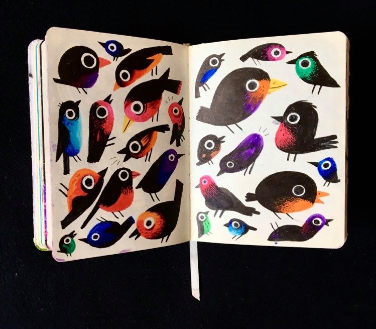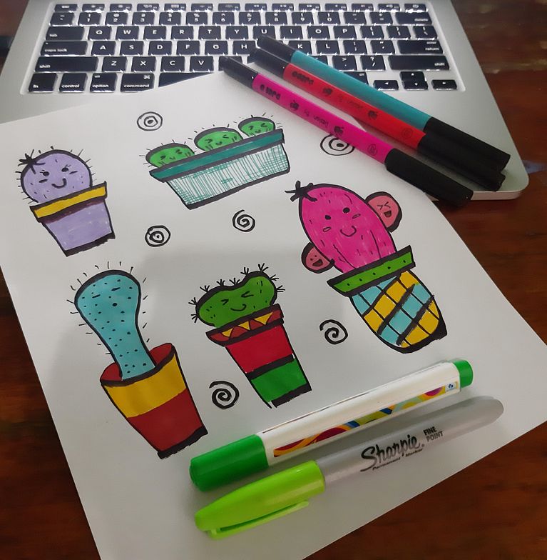 Boceto para el libro de colorear que estoy elaborando. Fue un ejercicio rápido con un marcador negro de punta biselada y luego apliqué colores de forma despreocupada, tratando de pensar en cómo lo pintaría un niño.