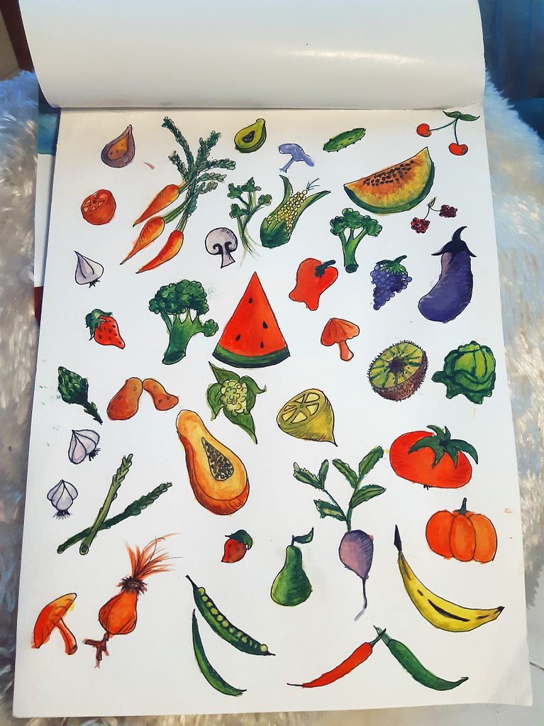 Esto hice hoy, un patrón de frutas y verduras, simple pero resultón, ¿para un paño de cocina por ejemplo? jajaja