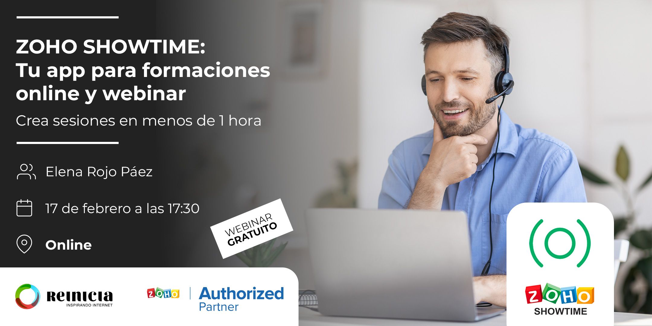 Únete a nosotros en nuestro próximo webinar online “ Zoho Showtime: Tu app para formaciones online y webinars” y aprende todo lo que necesitas saber para montar tu propio curso online.