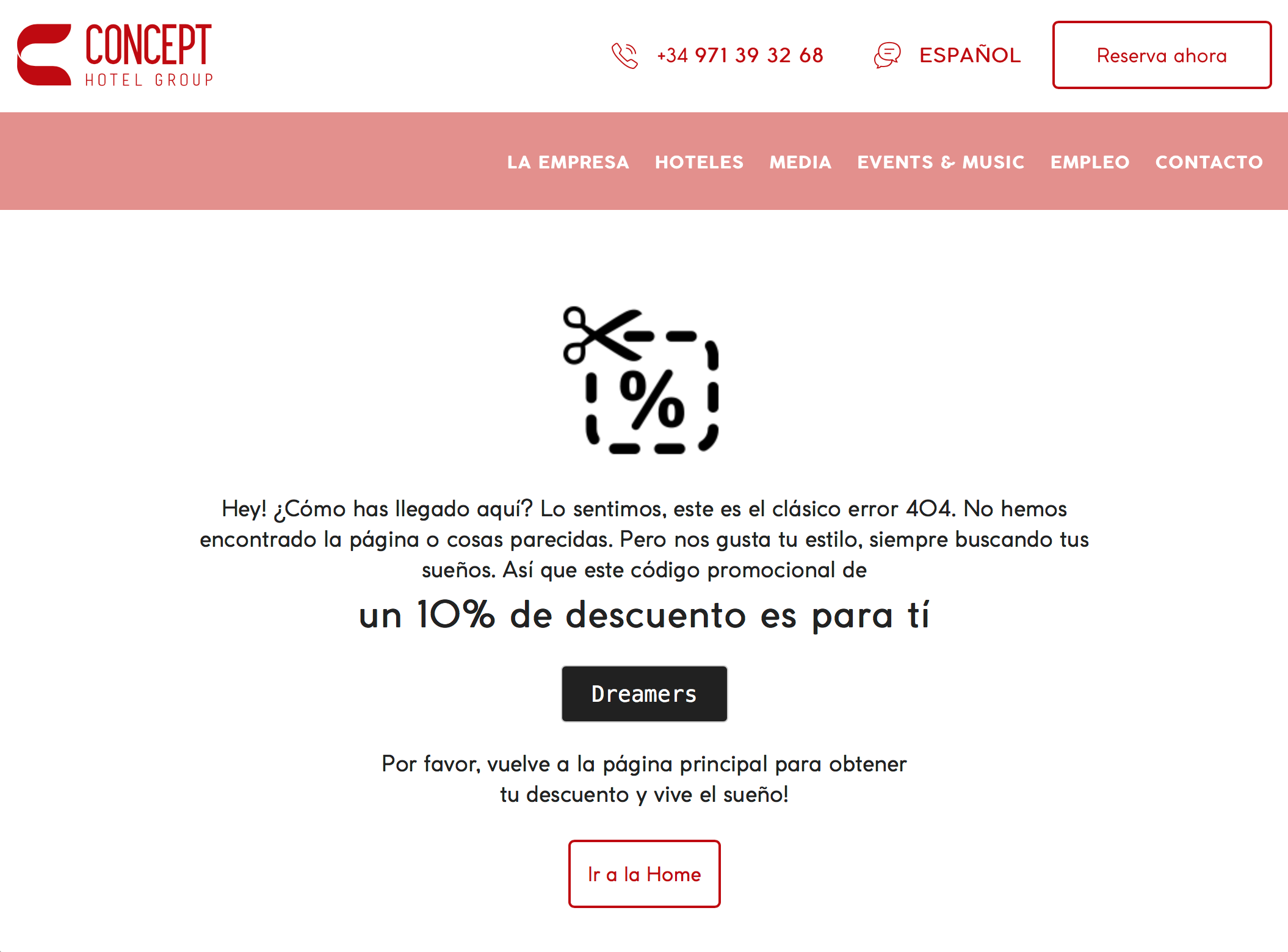 Yo me he topado con esta hace poco, es de una cadena de hoteles de Ibiza que cuidan mucho el detalle, en este caso te descuentan un 10% en las reservas por llegar a su página 404...