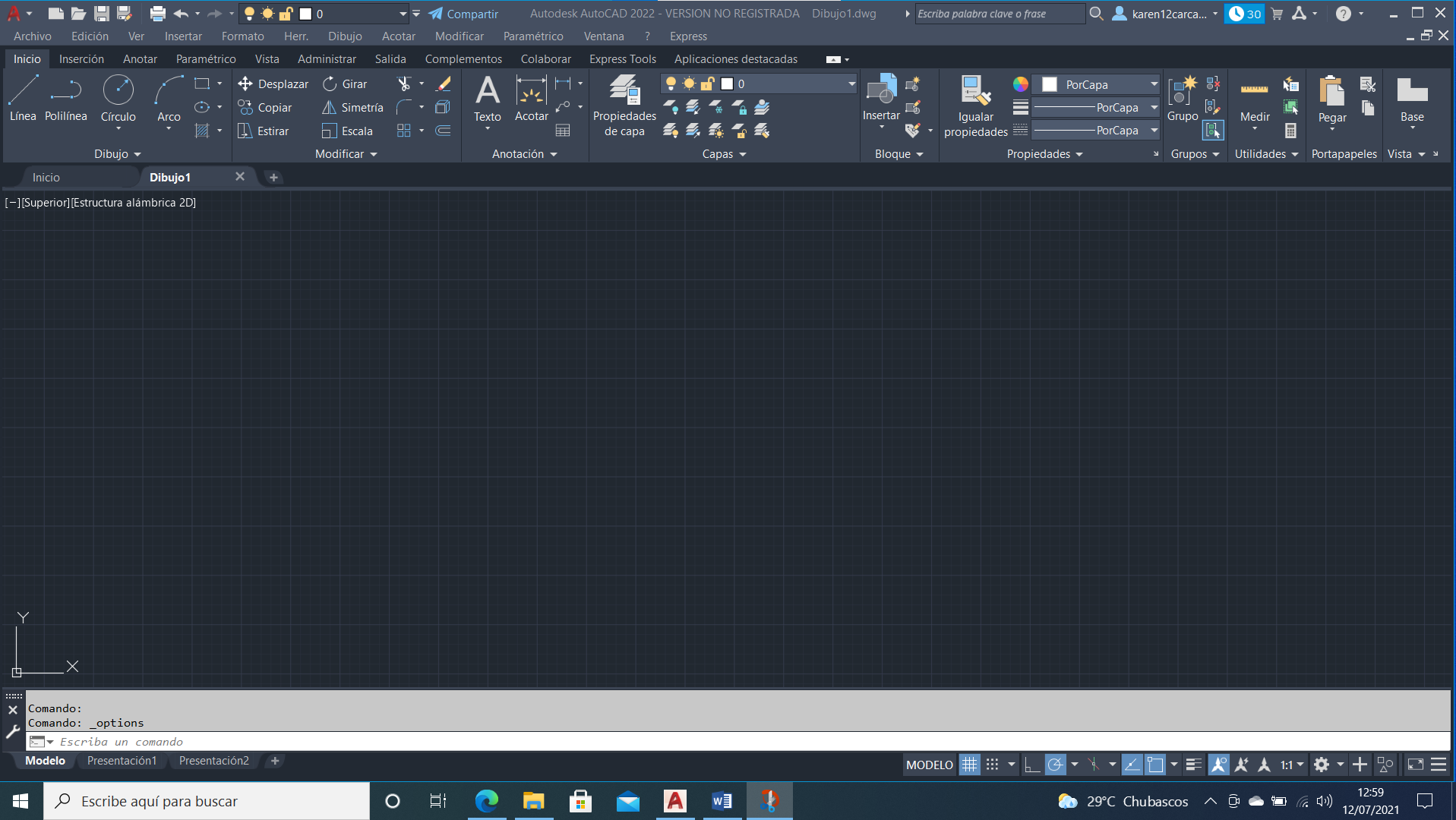 Foro de Revisión de trabajos AutoCAD Practica del Curso 1 el 12.07.2021 a las 21:02 por karen12carcamo · 1 comentario Seguir este temaSeguir este tema Dejar de seguir este tema Buen Dia. Adjunto la imagen de mi espacio de trabajo. Comentar Me gusta