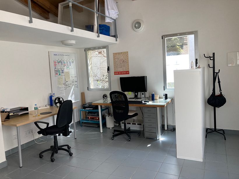 Hola, somos un estudio de Diseño, ofrecemos un espacio de trabajo en Madrid, zona Marqués de Vadillo al lado de Madrid Río. Es un edificio de varios locales de artistas, imprenta y editoriales.