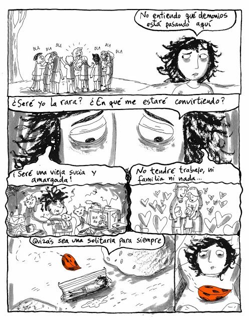 Esta es una novela gráfica que hice a partir de una hoja naranja que descubrí en un viaje. Me pareció tan especial y rara, que sobre eso empecé a dibujar, sobre sentirse diferente, no encajar. Así fueron saliendo personajes y una historia que habla de encontrar la propia identidad, el camino propio.