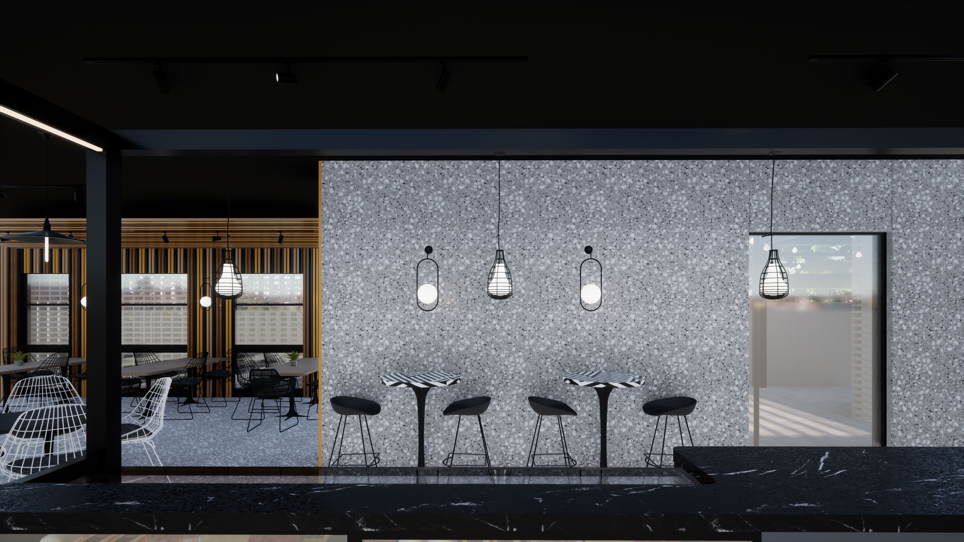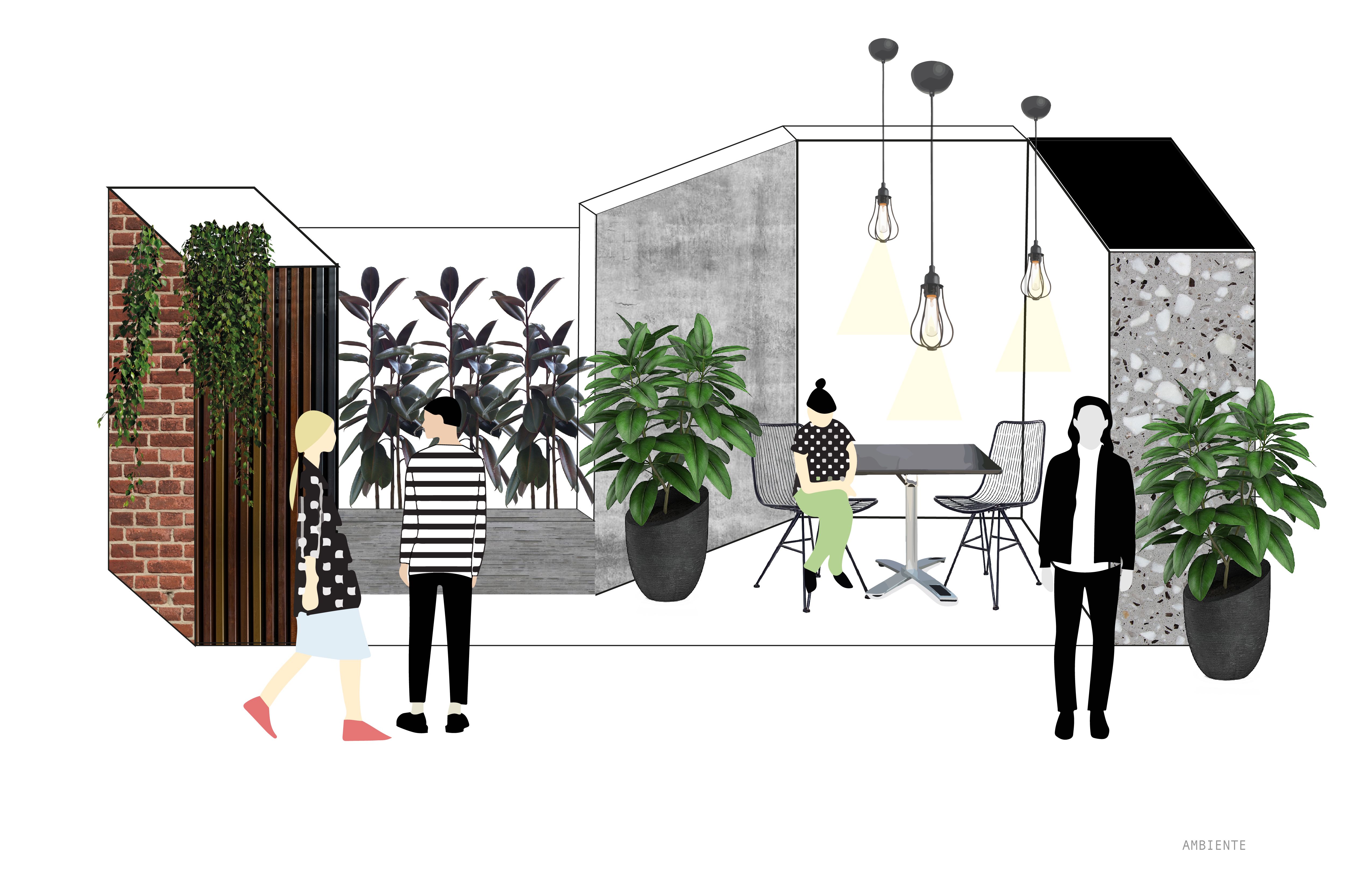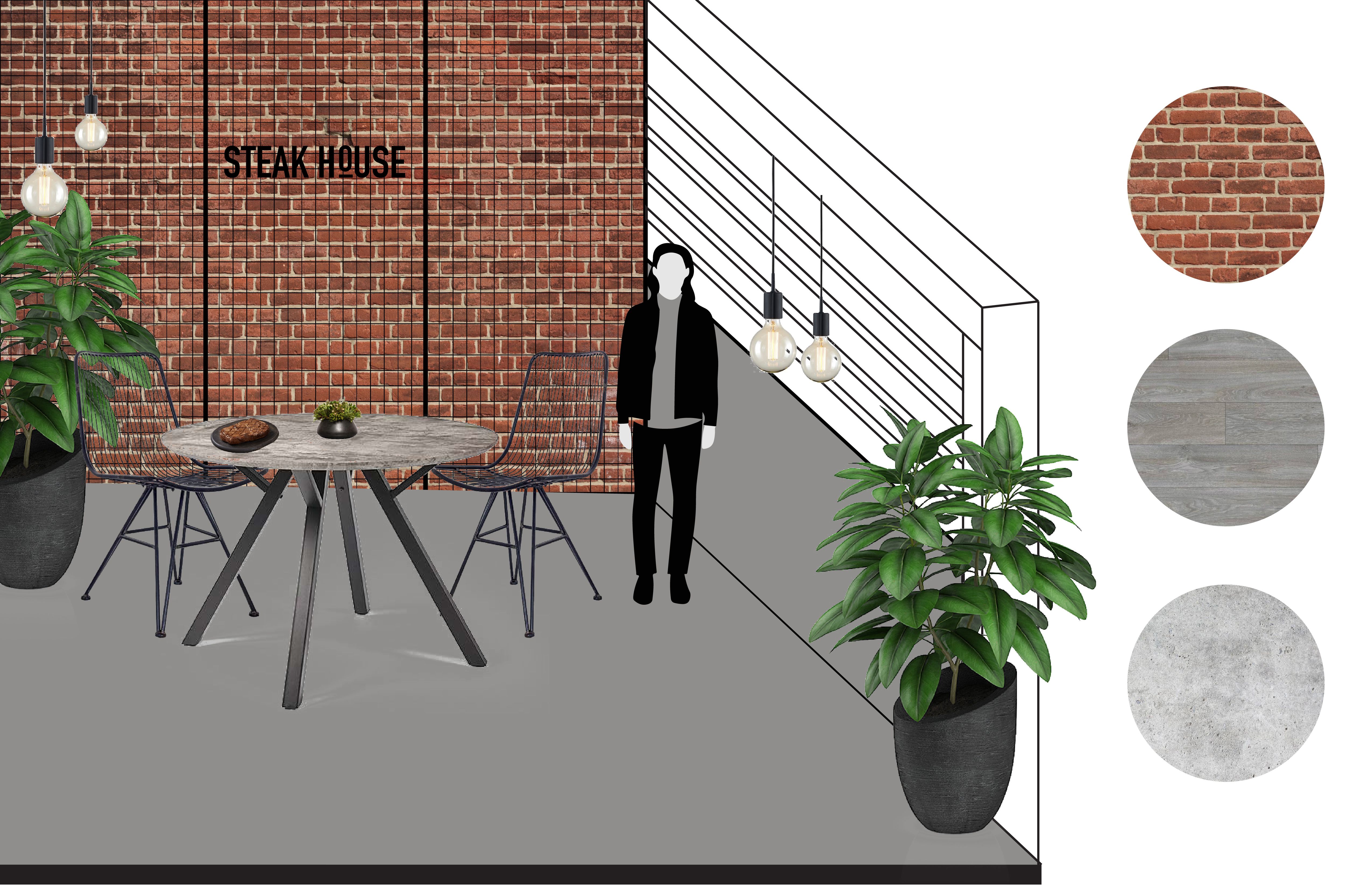 Inspirado en materiales industriales y ambientes de terrazas dominicanas, tales como el aluzinc, las varillas, madera rústica, concreto visto y block calados.