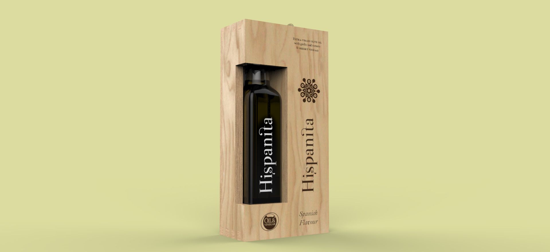 Diseño de embalaje para un producto típico español supuestamente a la venta en la cadena de tiendas internacional 'Oil & Vinegar'. Consiste en un set que incluye una edición especial de aceite y vinagre español: vinagre de Jerez y aceite de oliva virgen extra con sabor a ajo y tomate. El set incluye dos botellas de 250 ml en un estuche de madera de pino. La caja puede abrirse desde dos de sus lados deslizando la tapa.