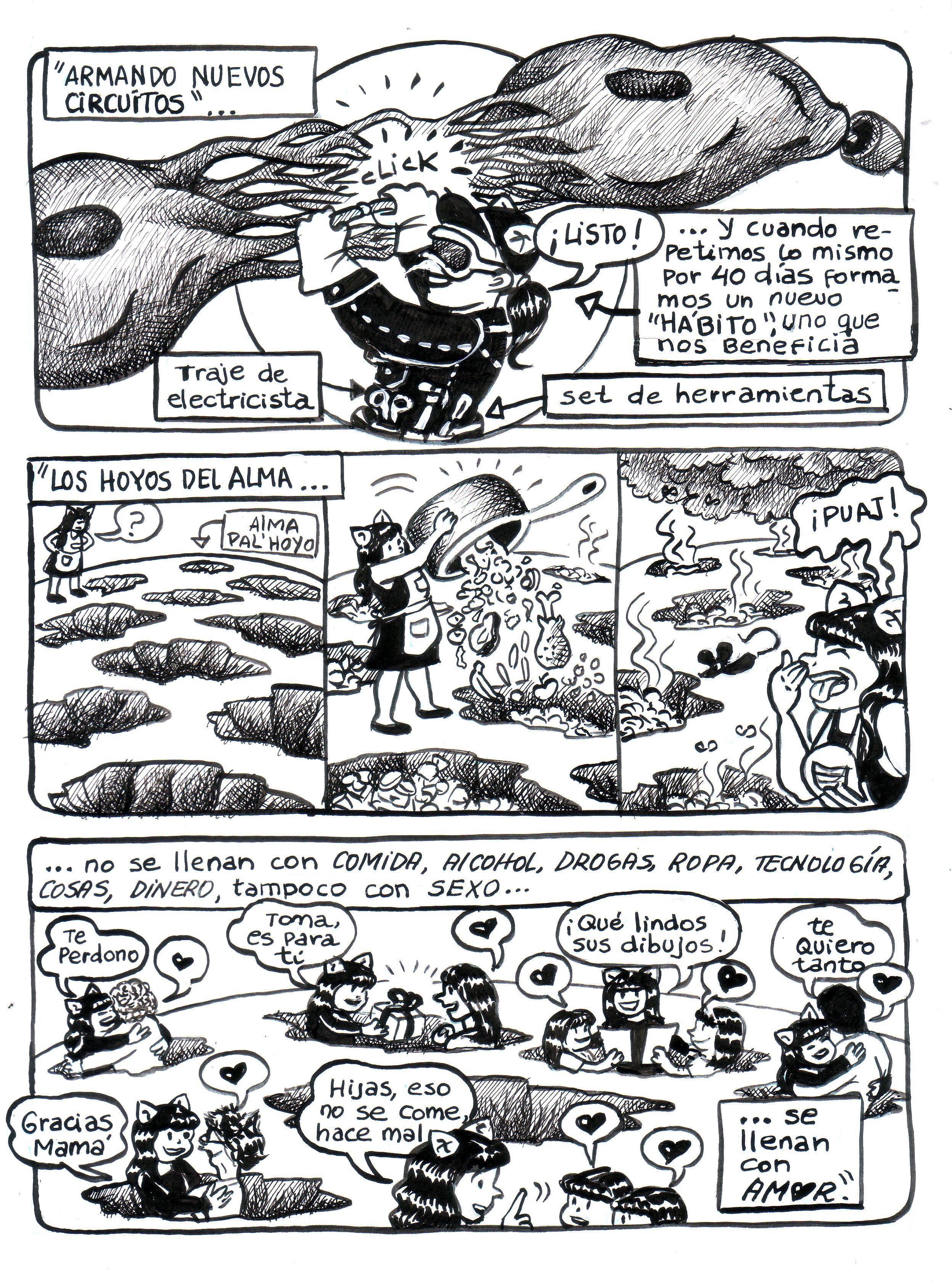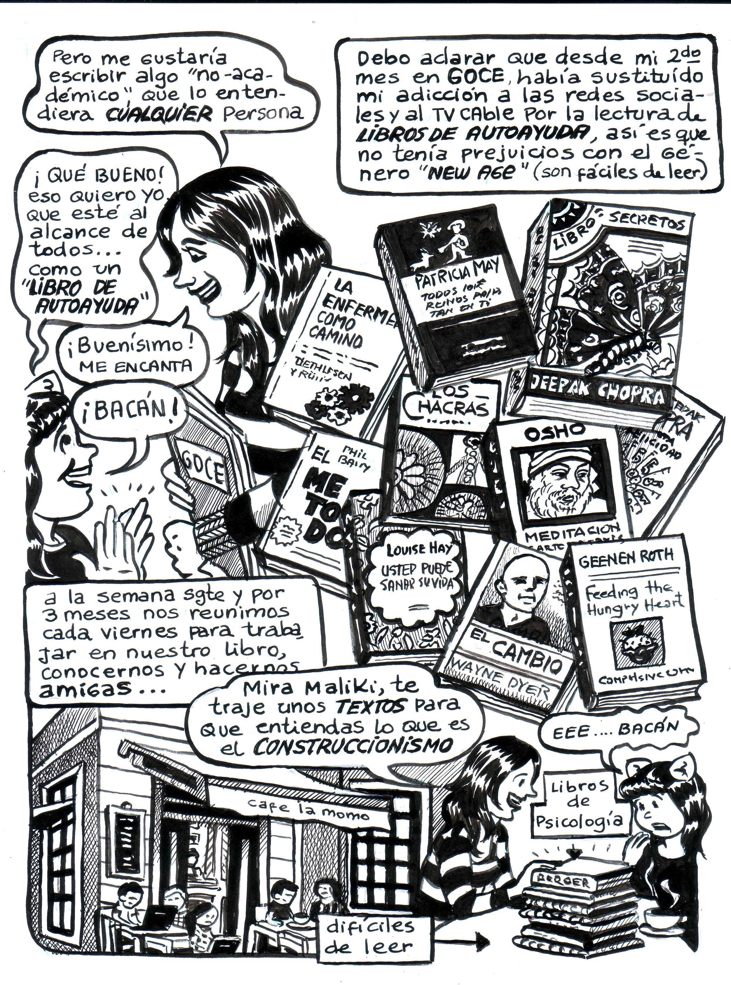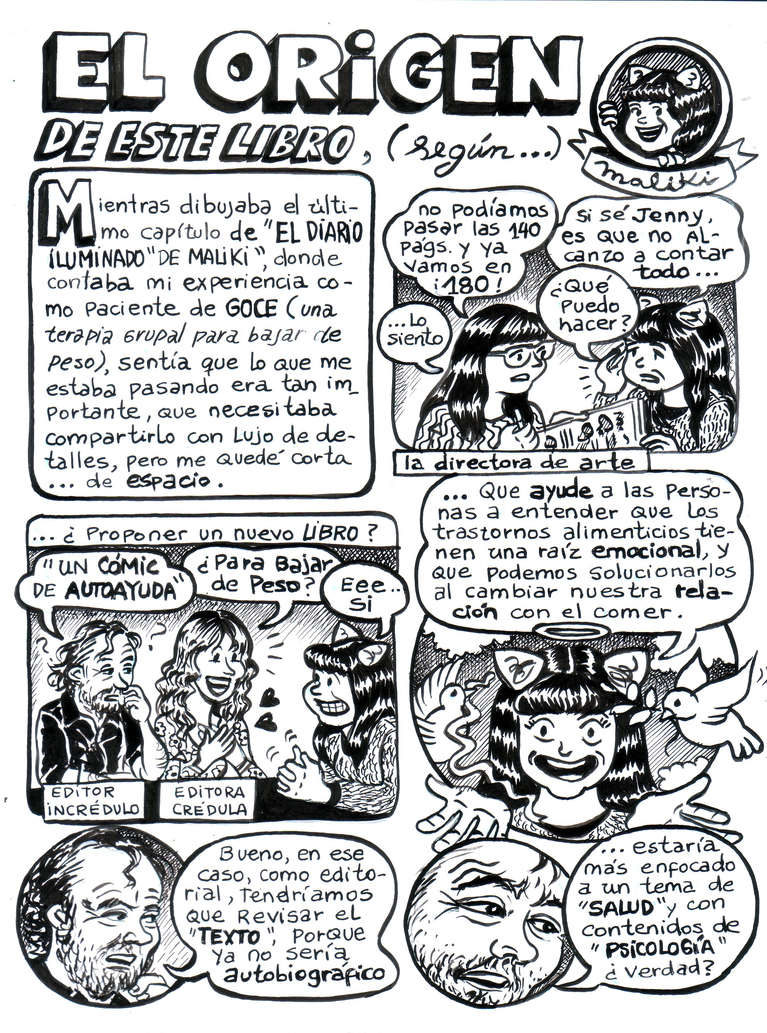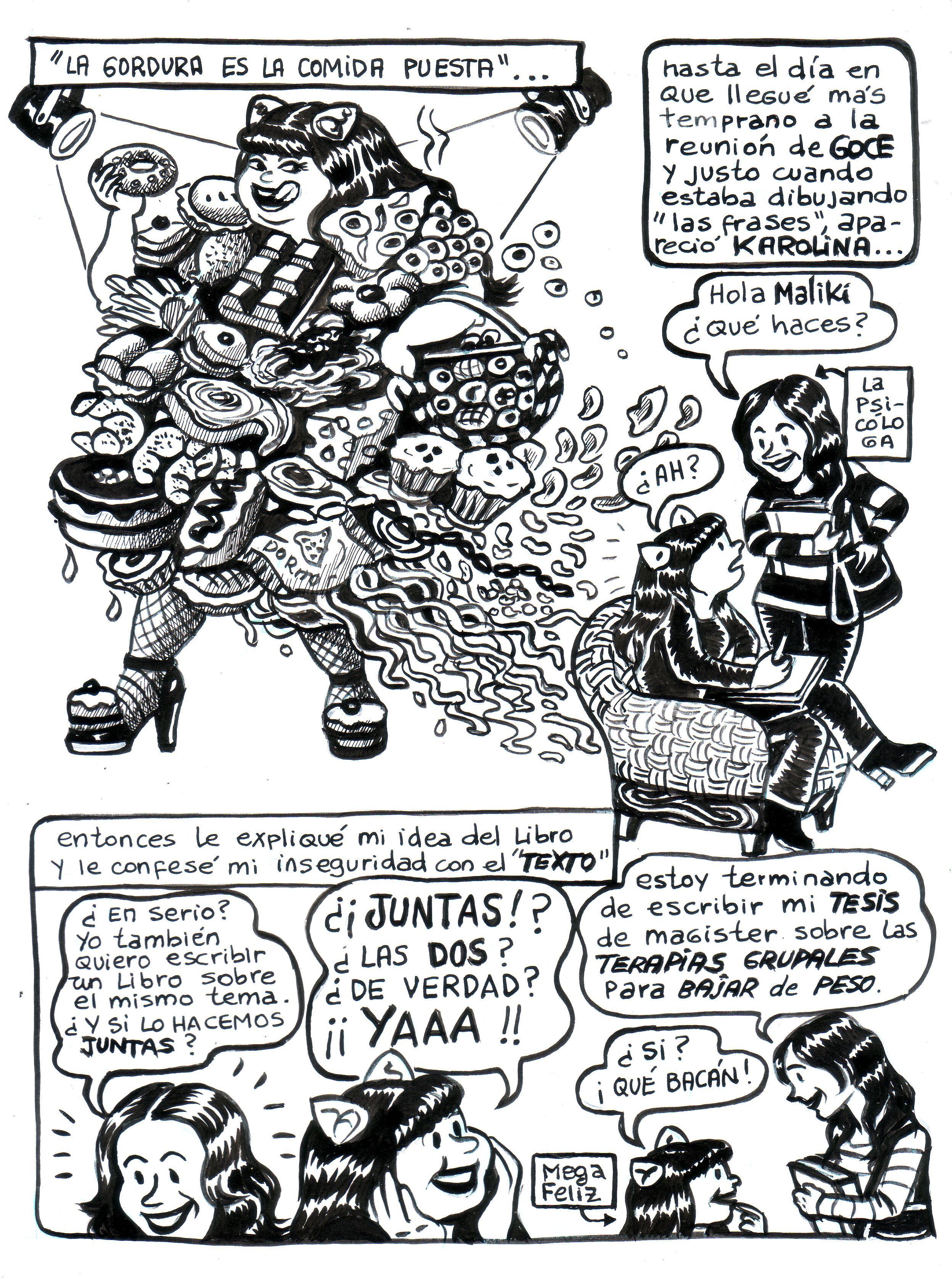 Quiero ser flaca y feliz es una frase que me he repetido toda la vida cuando me miro al espejo. Este libro nació en la sala de espera de una terapia grupal para bajar de peso a la que asistí, cuando la psicóloga del grupo vió que dibujaba las frases que ella me decía en la terapia. Se nos ocurrió hacer un libro juntas, ella lo escribió y yo lo ilustré. El prólogo, que son las págs que subí, son las únicas que escribí y dibujé sola. Este libro de autoayuda para bajar de peso lo hice con 30 kilos menos, 4 tallas más chicas de ropa, sin tomar una gota de alcohol y transformada en vegana. Honestamente sentía que el mundo estaba a mis pies, aunque la felicidad me fue esfumando poco a poco hasta hasta volver a ser la persona gorda, infeliz, trabajadora, generosa y creativa que he sido siempre. De todos modos este fue mi único libro best seller, pero como lo hicimos de a dos tampoco gané mucho. Lo que si gané fueron lectoras que jamás en la vida habían leído un cómic y que ahora leen mis otros libros.