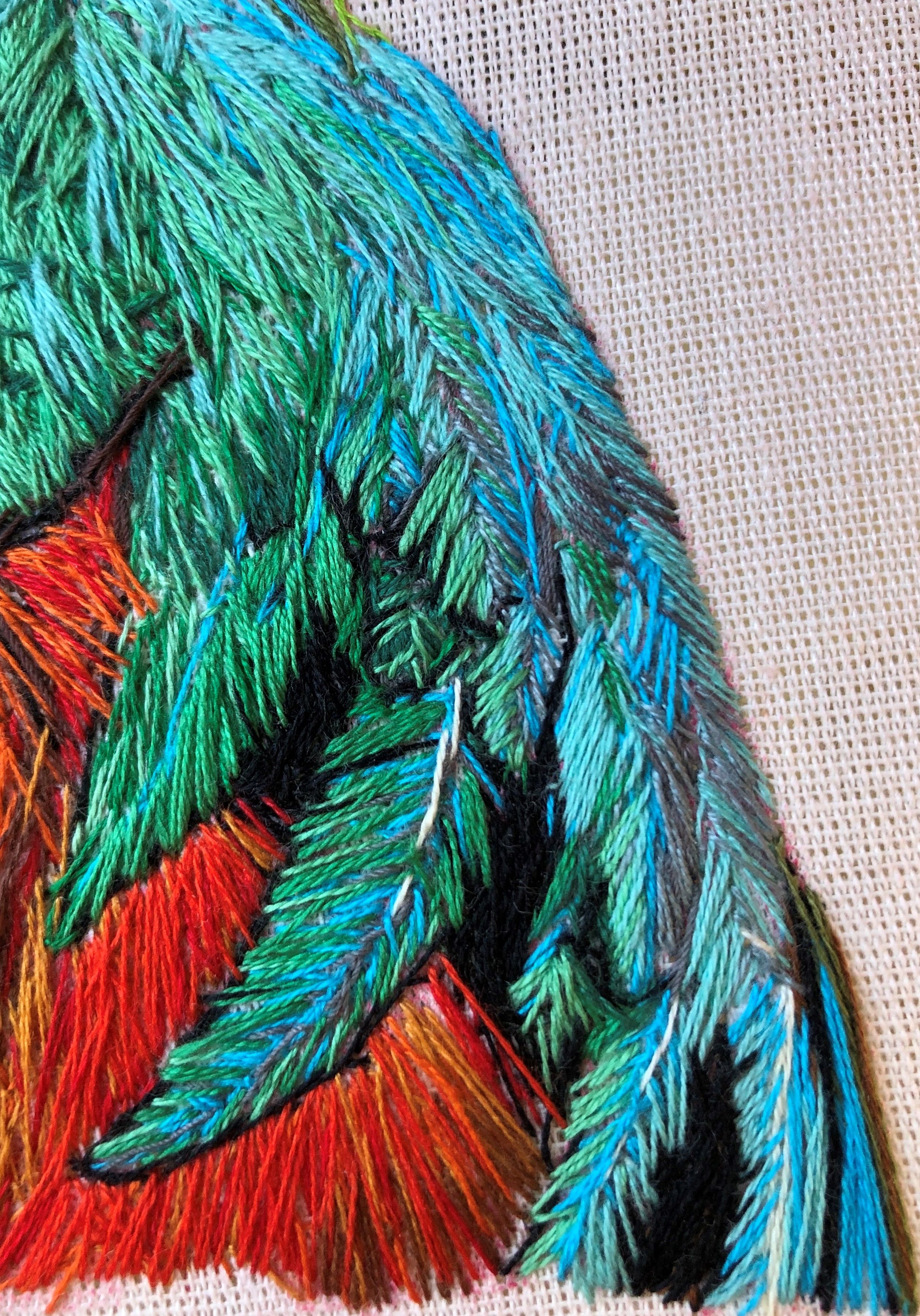 Elegí el ave QUETZAL porque me parece hermoso, sin embargo, como iba avanzando en el bordado me di cuenta que fue en especial difícil porque el ave tiene el plumaje muy rebelde y trate de plasmarlo de esa manera,