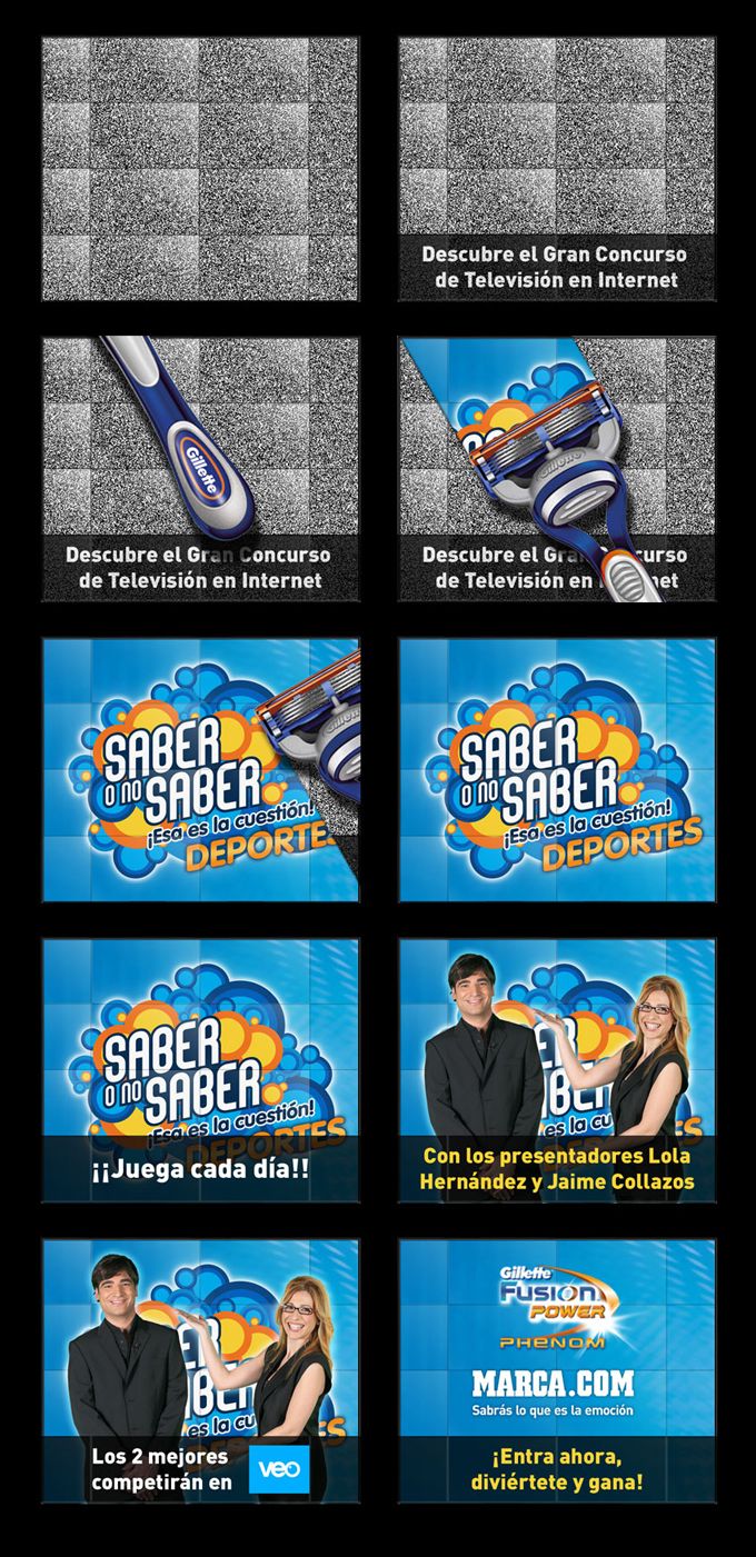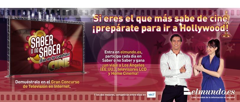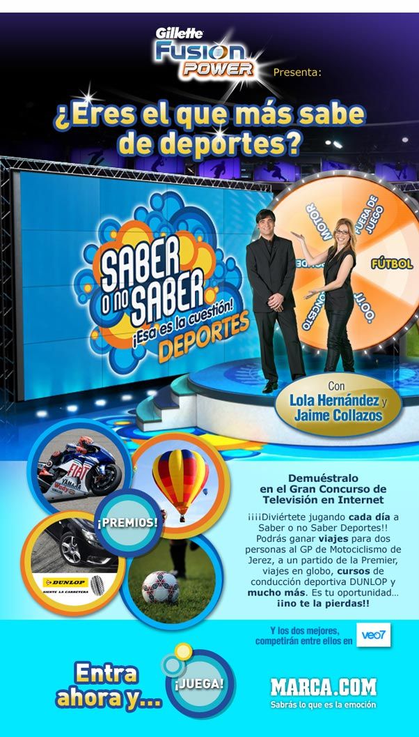 El primer concurso de televisión en Internet. Al más puro estilo televisivo (grabado en vídeo con actores reales) los usuarios competían en una especie de ruleta de la fortuna como si estuvieran participando en un programa de televisión. En dos versiones, deportes para MARCA.com (patrocinada por Gillette) y cine para elmundo.es. PIEZAS: microsites, e-mailings, banners, prensa y radio.