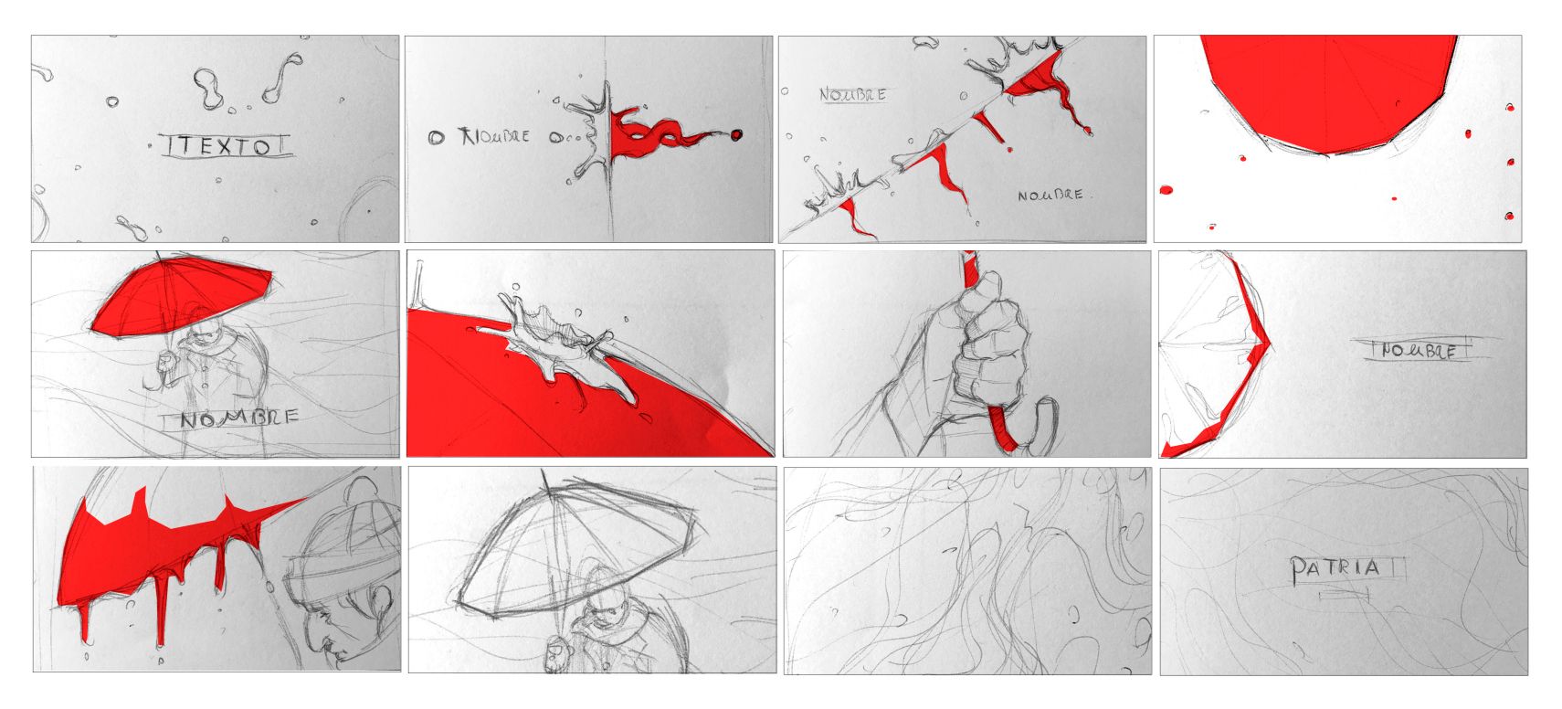 Después de varias propuestas donde aparecían personajes de la trama nos dimos cuenta de que los títulos habían quedado demasiado evidentes y que el factor simbólico que buscábamos al inicio se había empañado un poco, así que decidimos quitar lastre y dejar solo los elementos más icónicos: LLuvia y paraguas.